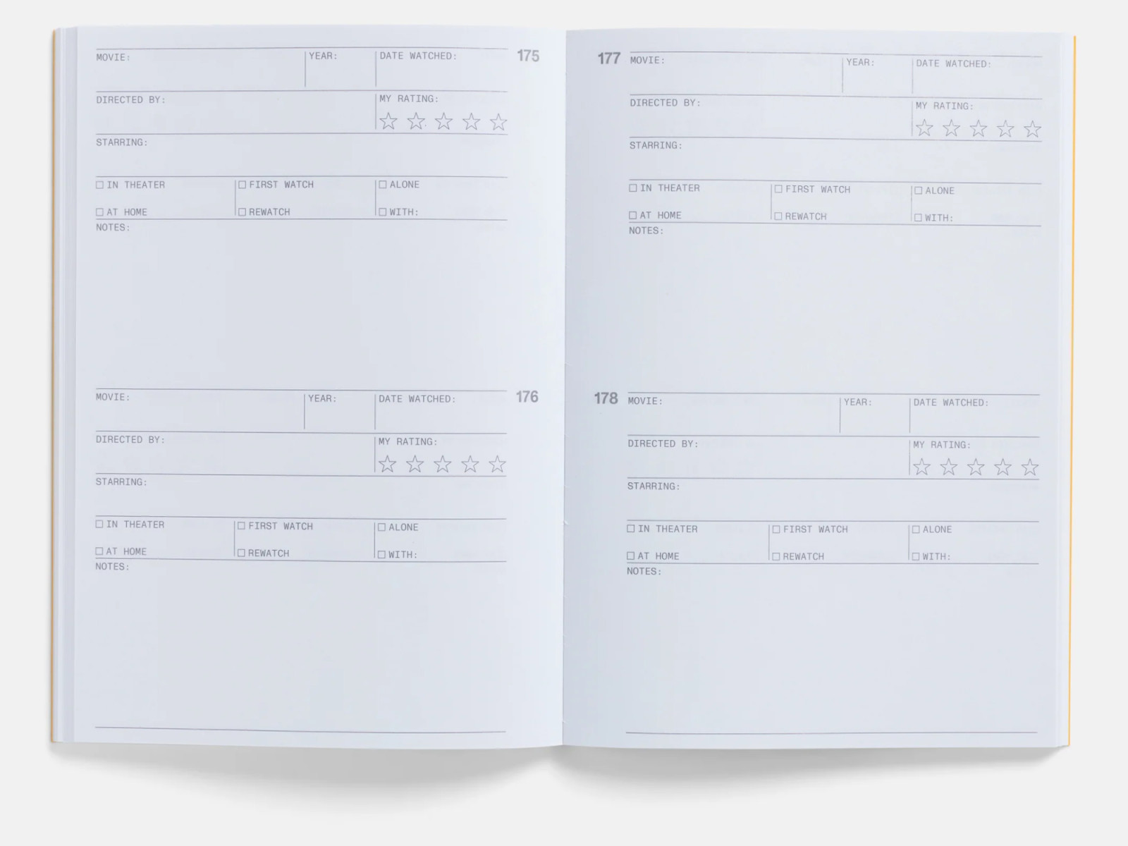 В студии A24 представили Movie Log – идеальный блокнот для любителей кино. Его концепция схожа с системой ведения журнала просмотра на платформе Letterboxd: можно фиксировать и оценивать просмотренные фильмы, писать рецензии, заметки, отмечать название картины, имена режиссеров, актеров, место и дату просмотра, а также вести список фильмов, которые планируешь посмотреть. 176-страничный блокнот Movie Log с минималистичным дизайном рассчитан более чем на 300 фильмов.