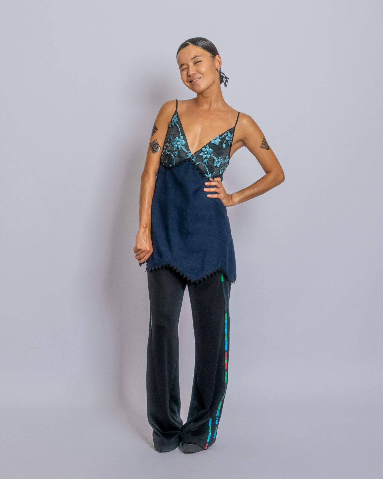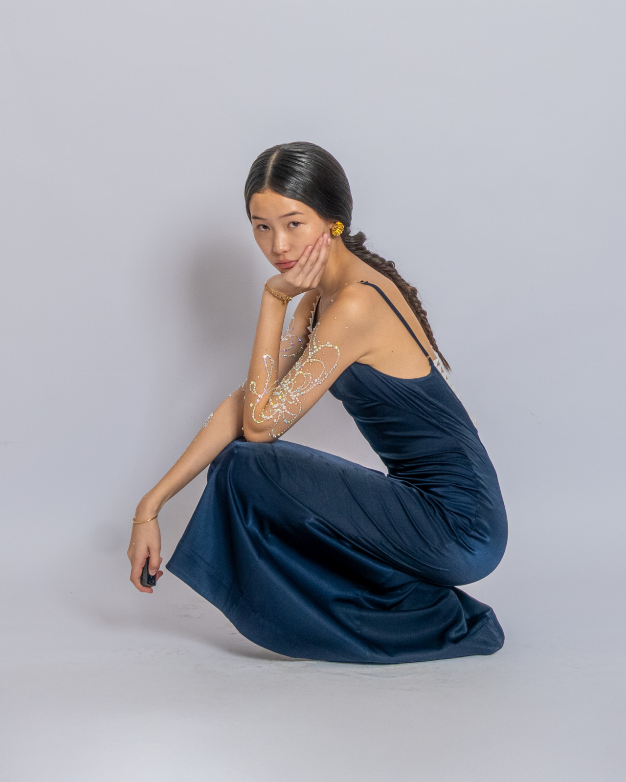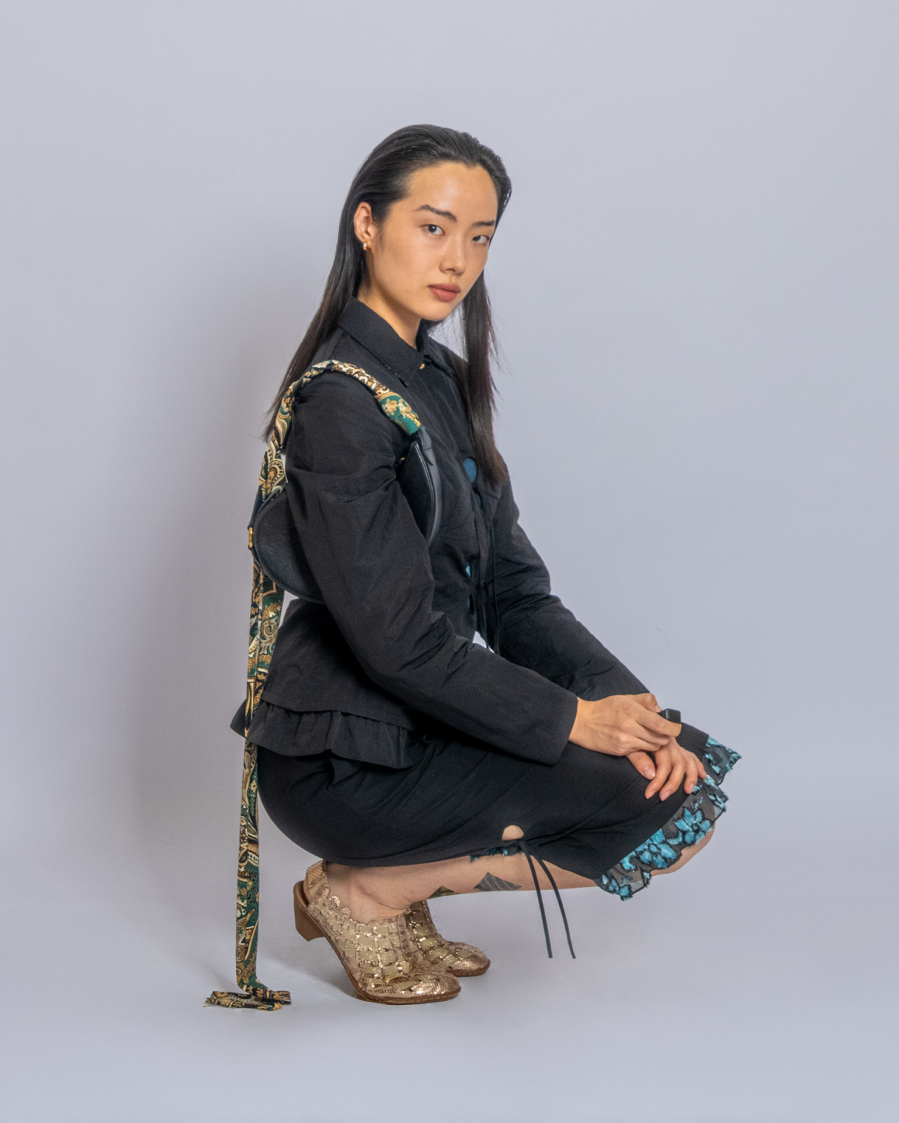 В прошлый четверг в Центральном Государственном музее Алматы прошел показ J.KIM весна-лето 2026 Quroq. Пока гости рассаживались под гул прожекторов, за кулисами мы запустили маленький эксперимент: в руки моделей попали кликеры – пульты дистанционного спуска. В итоге бэкстейдж превратился в серию интимных автопортретов, где взгляд камеры – это их собственный. Нейтральный белый фон словно выключил шум суеты бэкстейджа, оставив только ткани, жесты и дыхание людей. Получились живые кадры с честными силуэтами без фильтров, где видно, как одежда будет выглядеть в реальной жизни.
