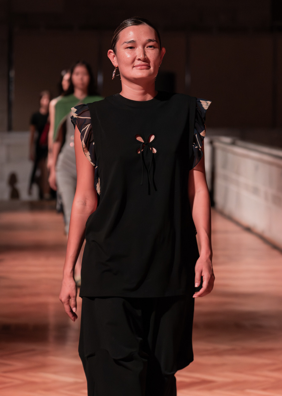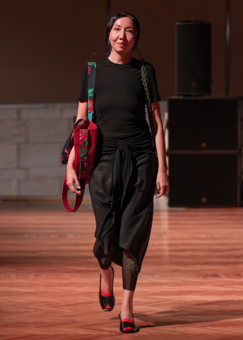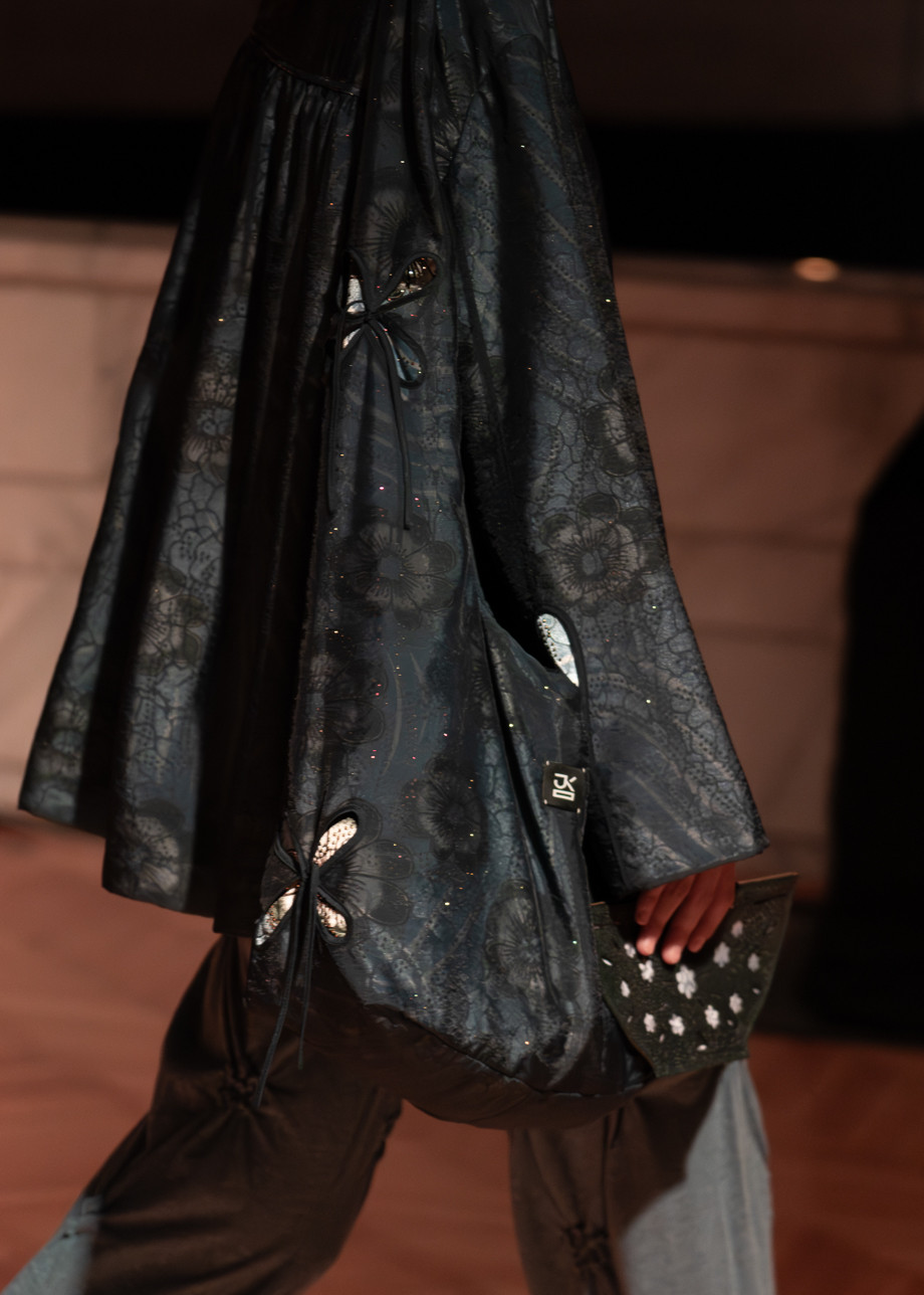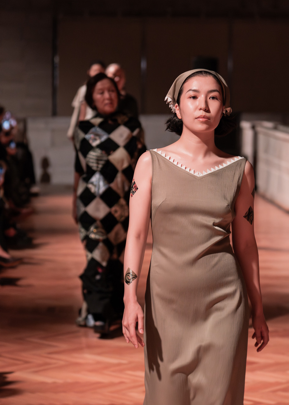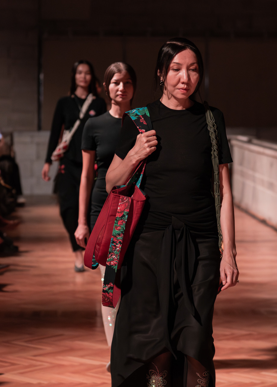 Модели выходили с пиалами, будто помогали накрывать на стол, а на ногах у них была «бабушкина» обувь со следочками – как носят наши тате. Атмосфера получилась настолько аутентичной, что хотелось усесться за стол и попросить чай. Впрочем, именно так гости и сделали в конце показа – стол, который был частью сет-дизайна, накрыли ташкентскими угощениями. Музыкальное сопровождение создал узбекский продюсер Josef Tumari: звуки ножа по доске, журчание воды, звон посуды и женское напевание без слов – все это складывалось в ту самую домашнюю симфонию.