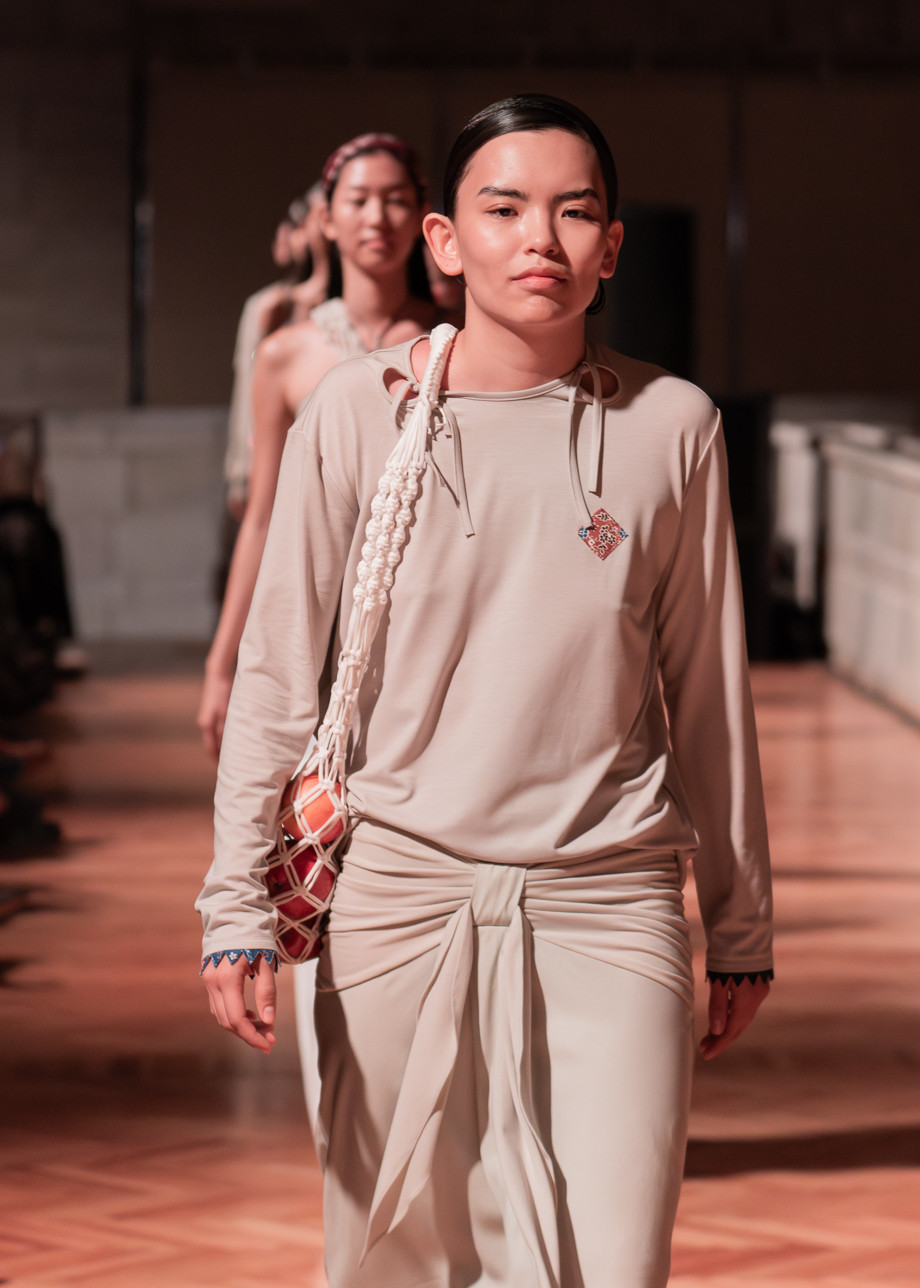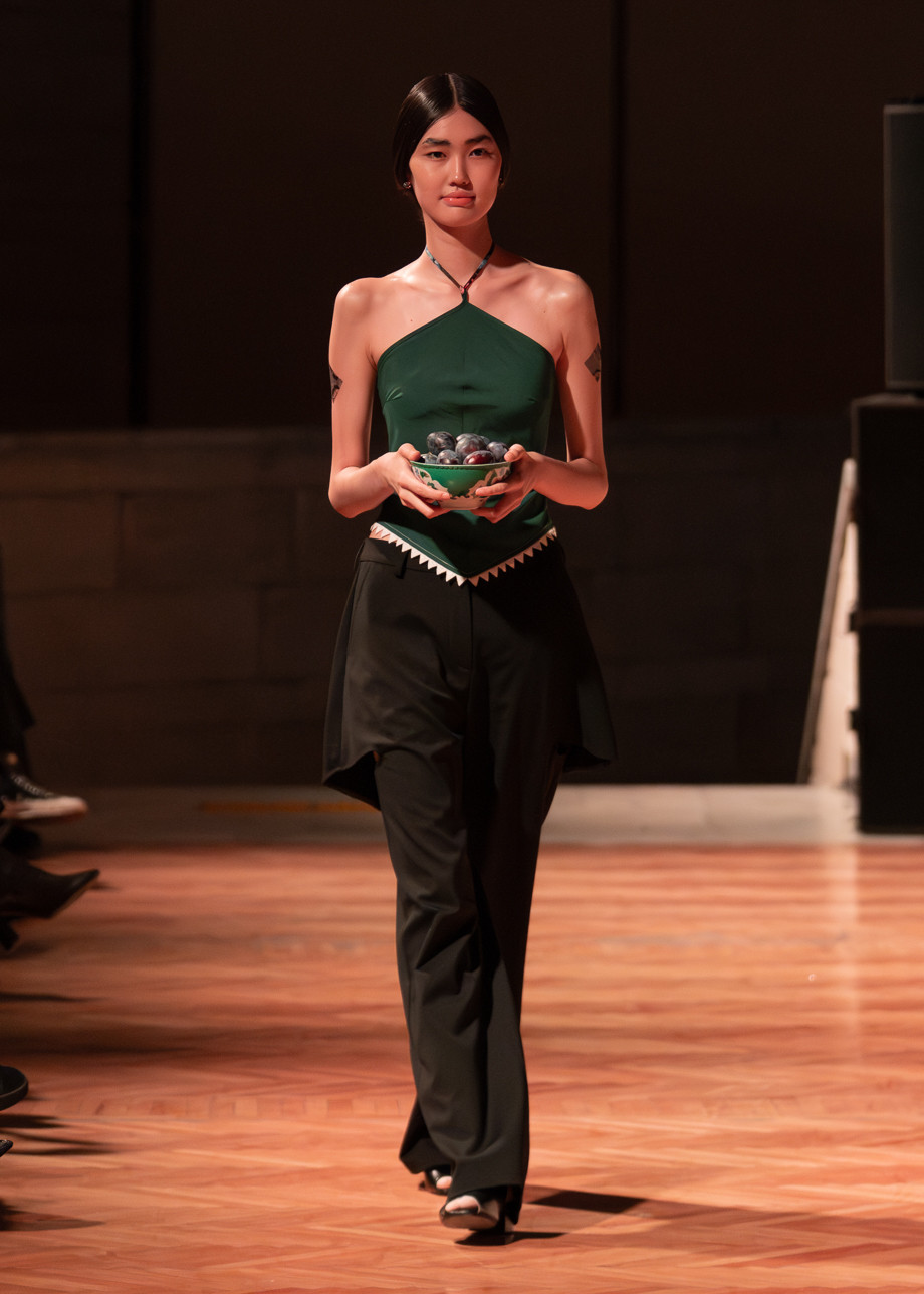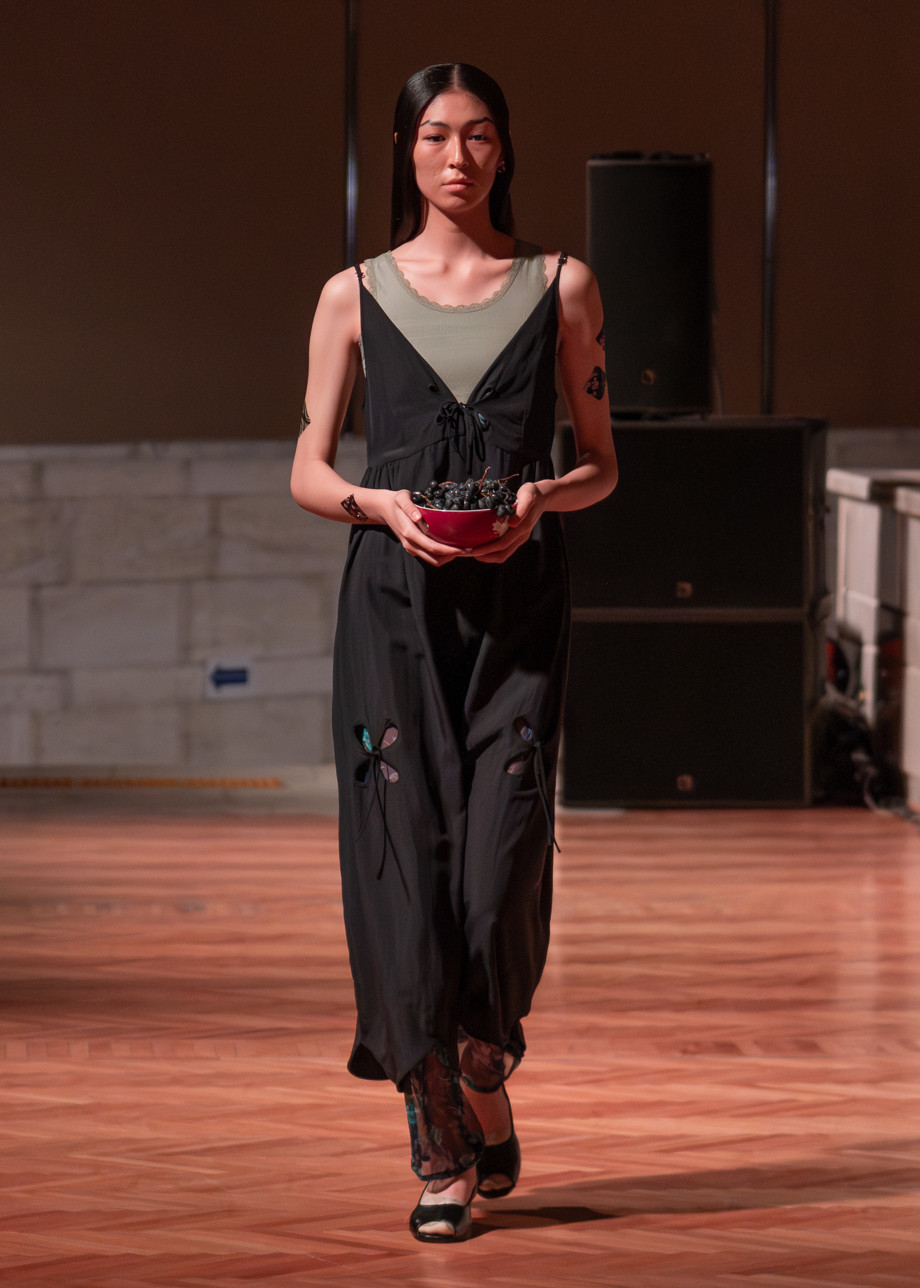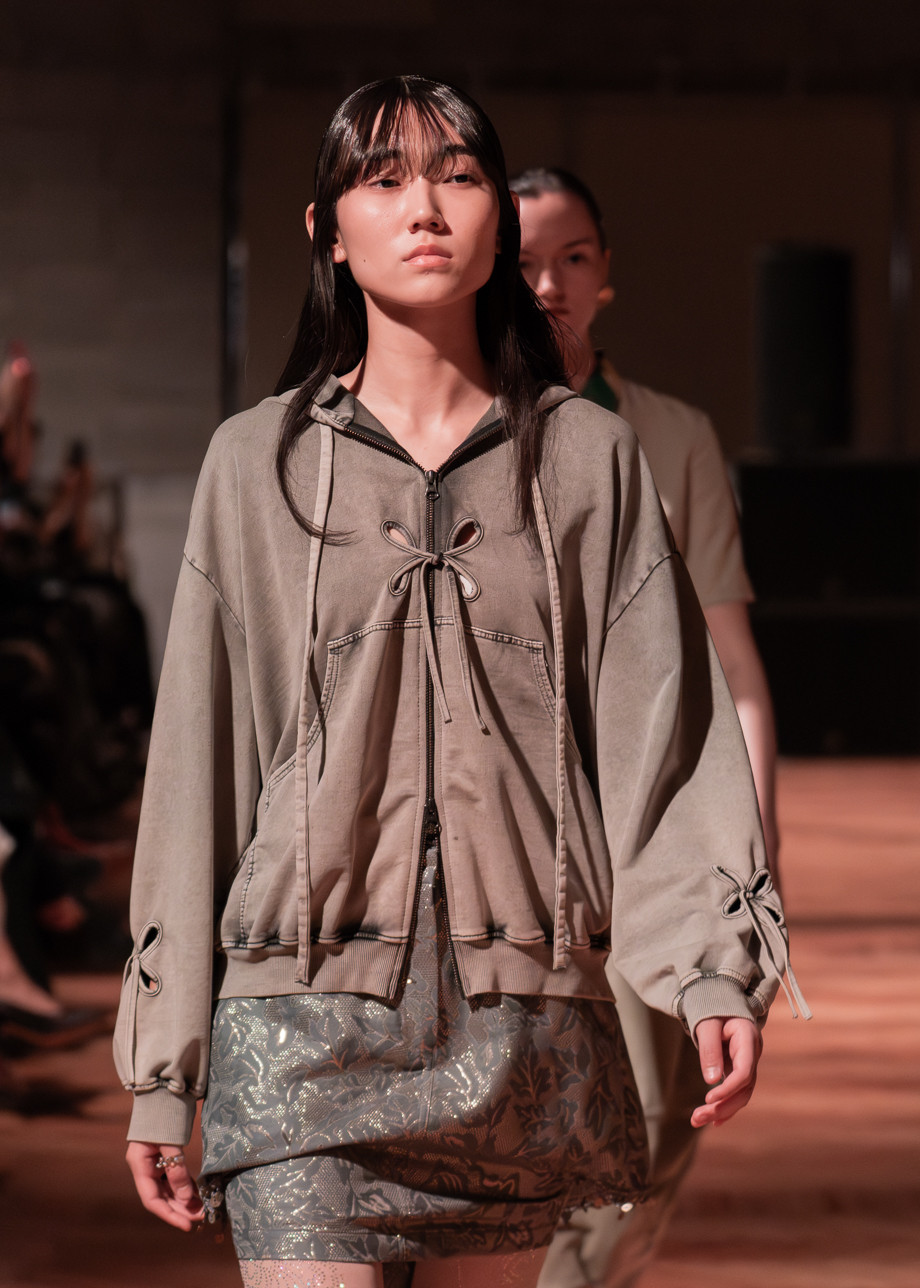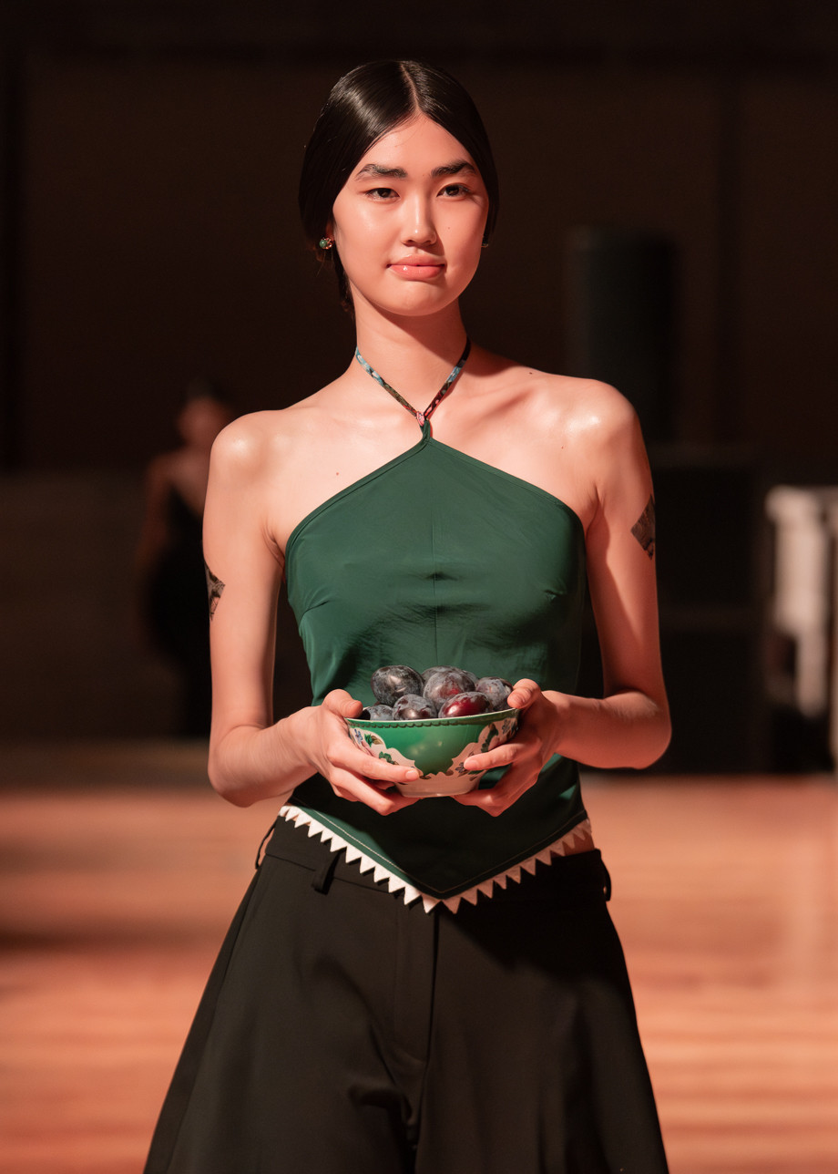 Модели выходили с пиалами, будто помогали накрывать на стол, а на ногах у них была «бабушкина» обувь со следочками – как носят наши тате. Атмосфера получилась настолько аутентичной, что хотелось усесться за стол и попросить чай. Впрочем, именно так гости и сделали в конце показа – стол, который был частью сет-дизайна, накрыли ташкентскими угощениями. Музыкальное сопровождение создал узбекский продюсер Josef Tumari: звуки ножа по доске, журчание воды, звон посуды и женское напевание без слов – все это складывалось в ту самую домашнюю симфонию.