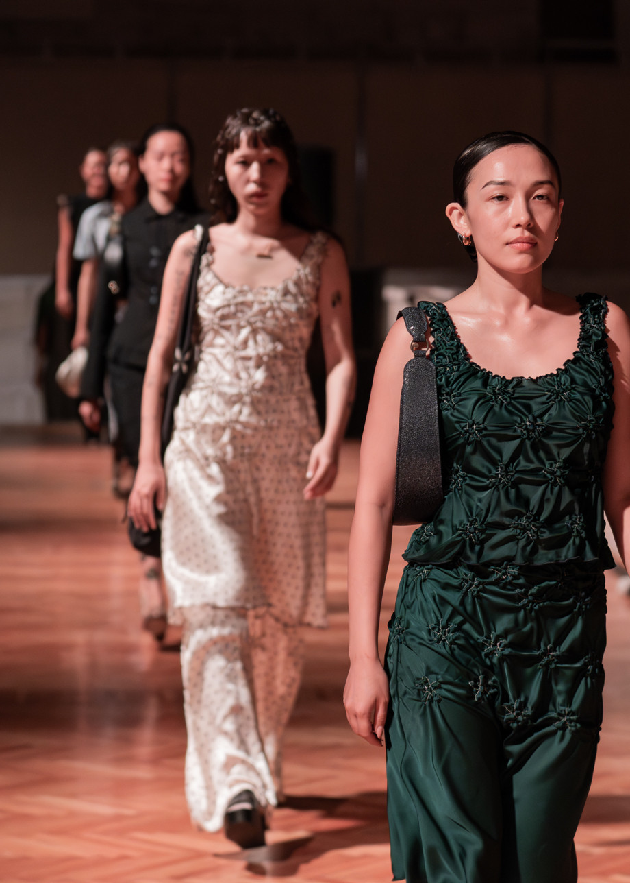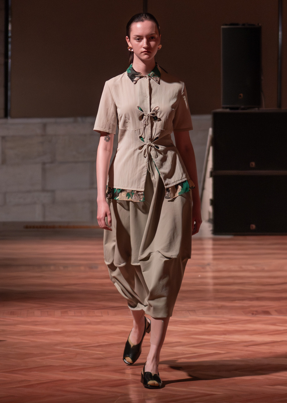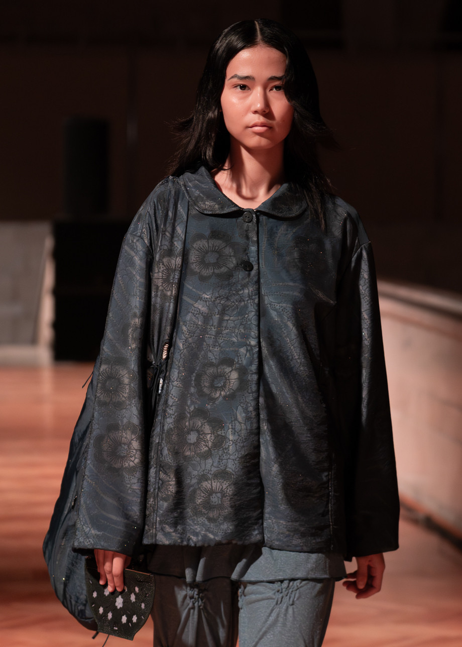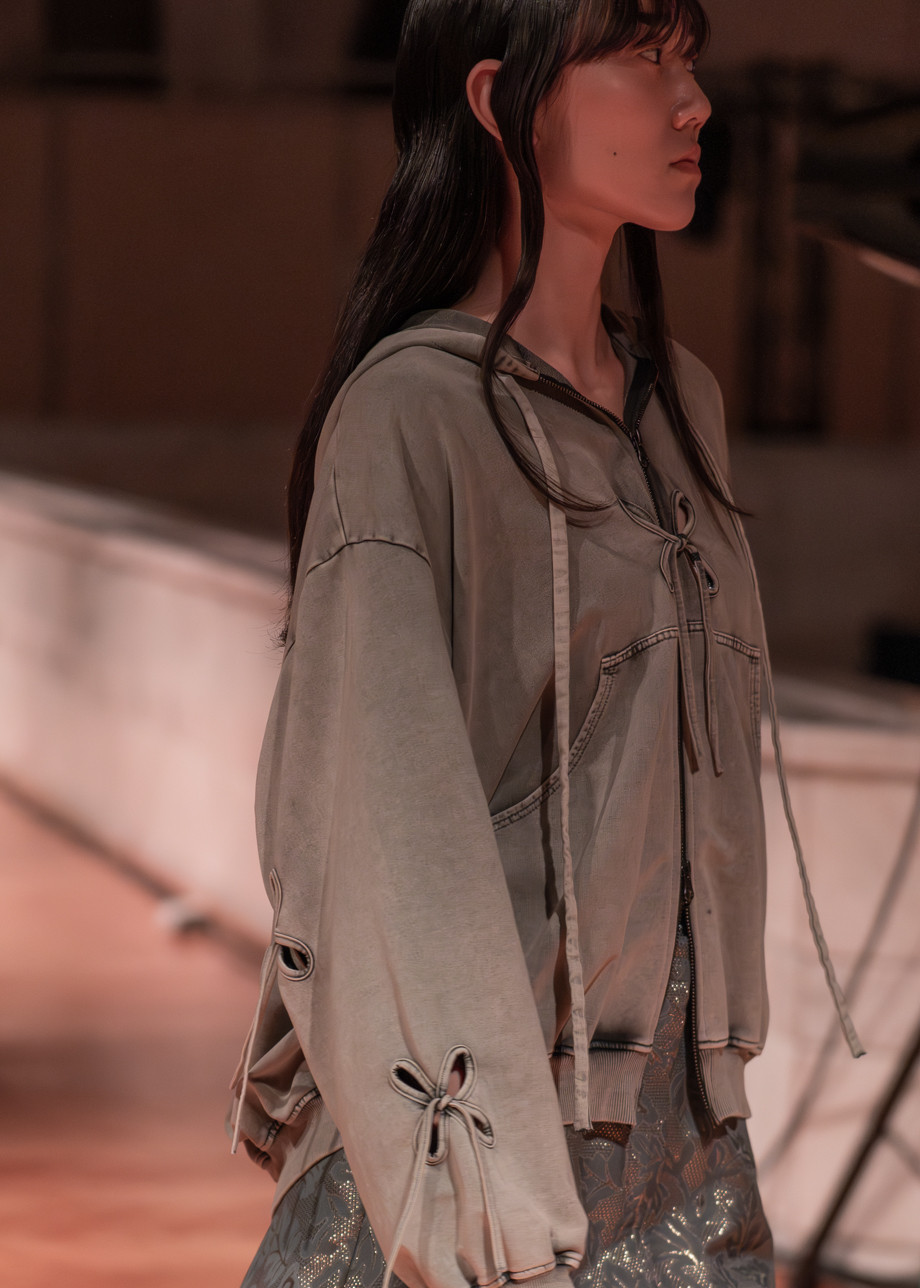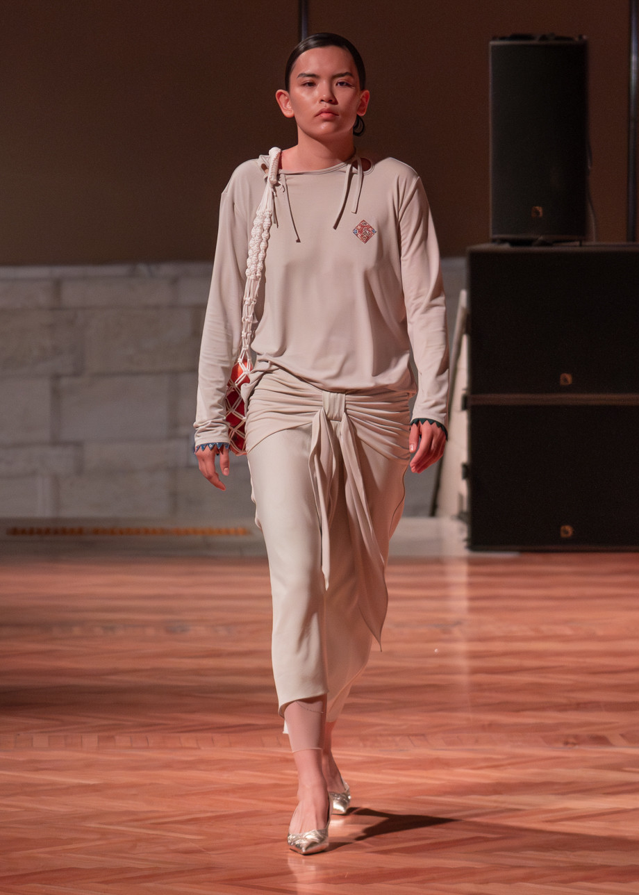 Модели выходили с пиалами, будто помогали накрывать на стол, а на ногах у них была «бабушкина» обувь со следочками – как носят наши тате. Атмосфера получилась настолько аутентичной, что хотелось усесться за стол и попросить чай. Впрочем, именно так гости и сделали в конце показа – стол, который был частью сет-дизайна, накрыли ташкентскими угощениями. Музыкальное сопровождение создал узбекский продюсер Josef Tumari: звуки ножа по доске, журчание воды, звон посуды и женское напевание без слов – все это складывалось в ту самую домашнюю симфонию.