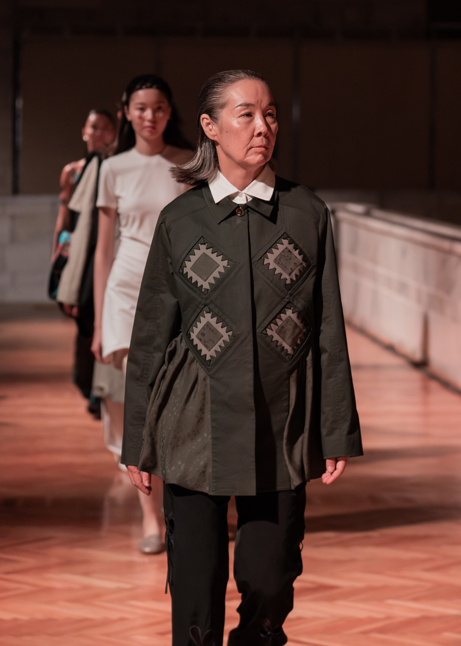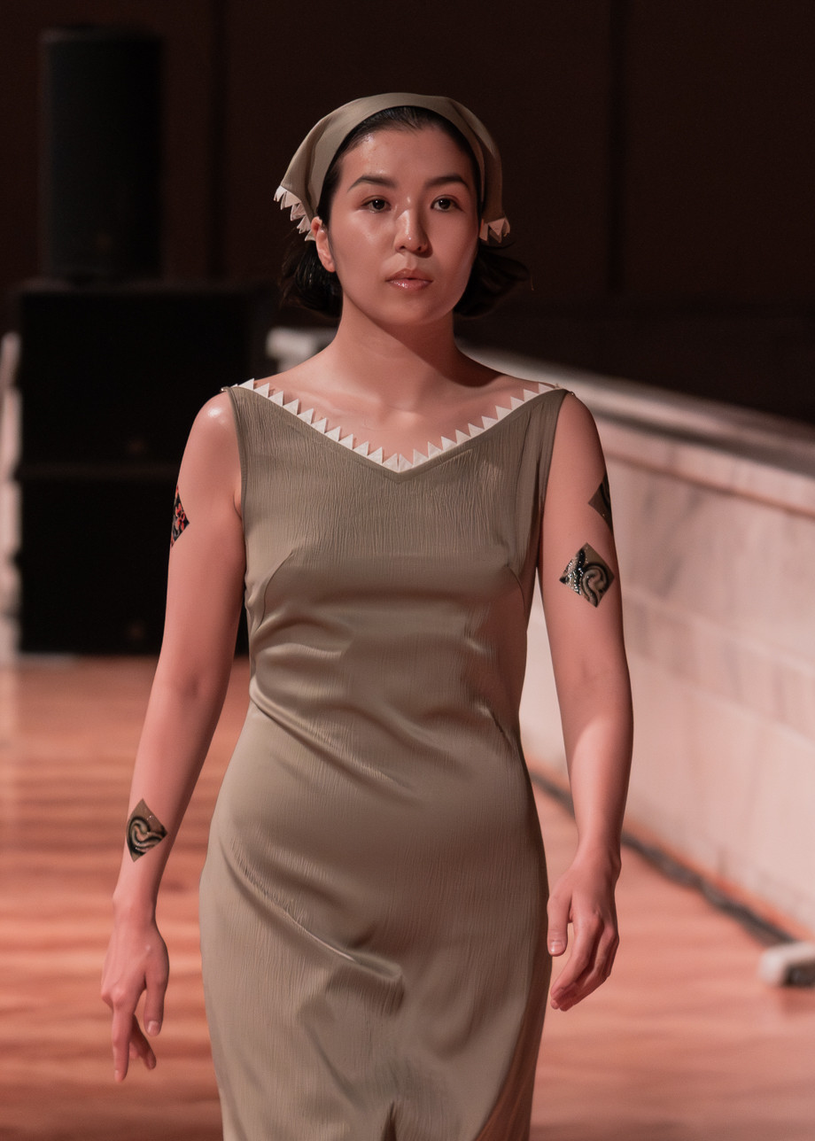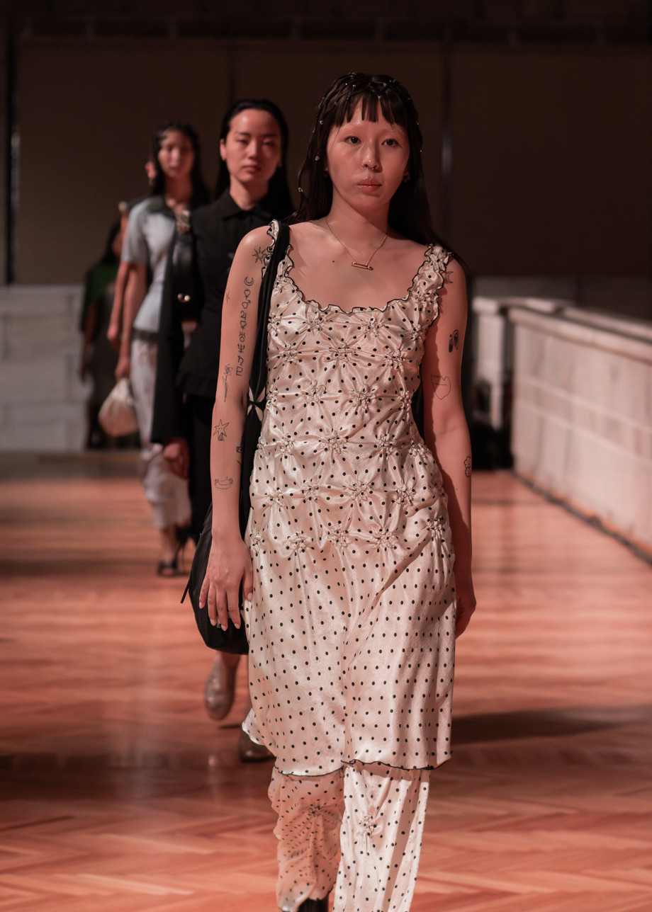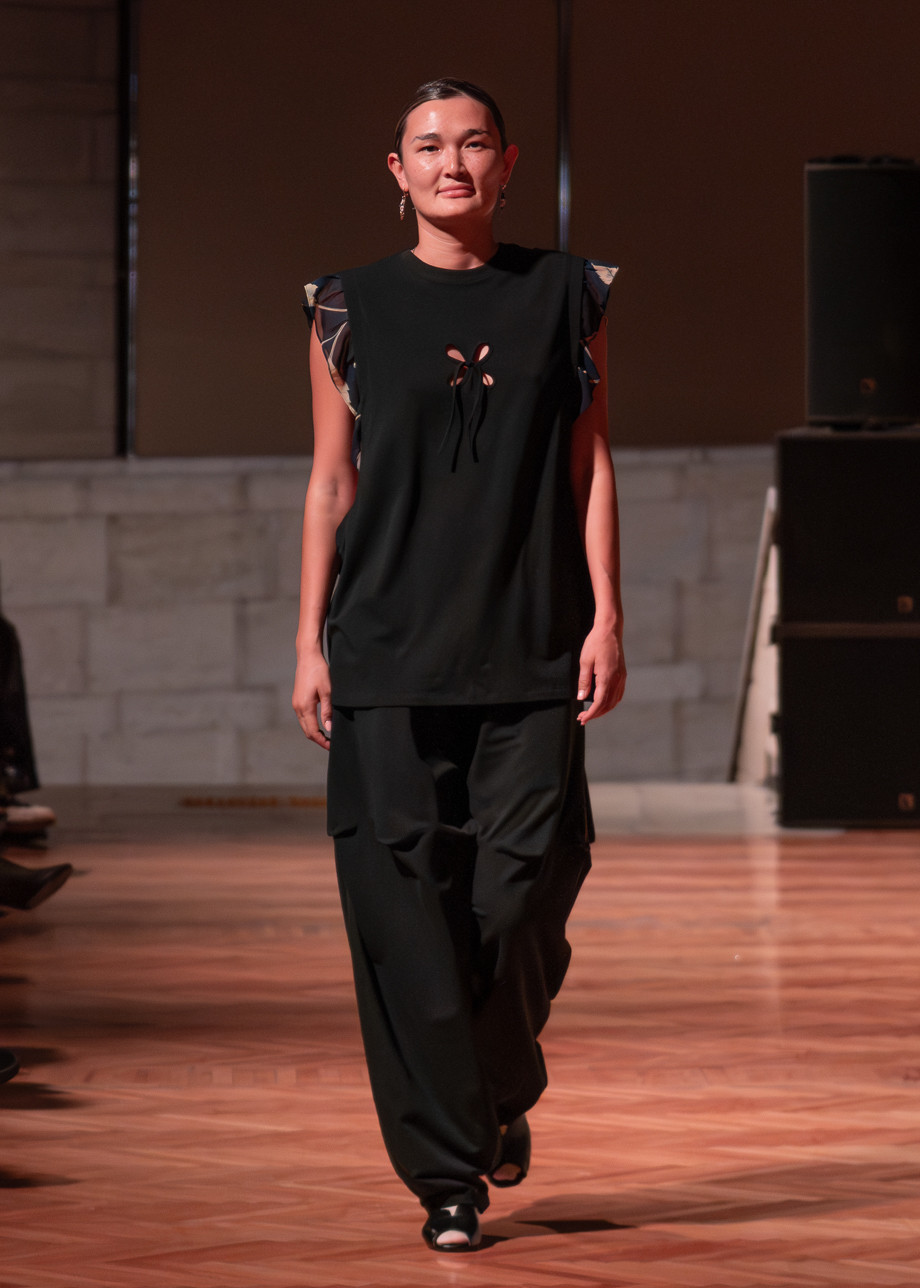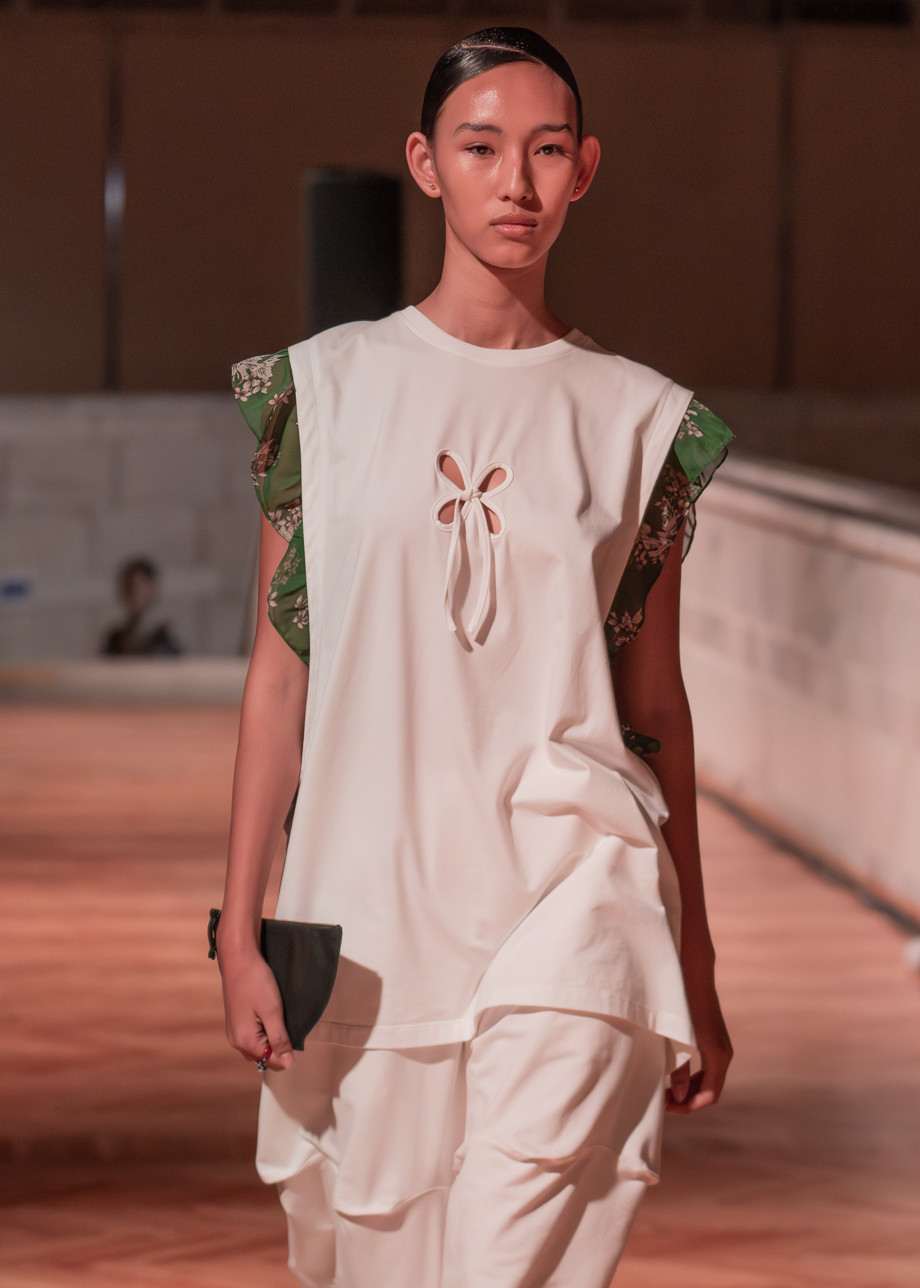 Модели выходили с пиалами, будто помогали накрывать на стол, а на ногах у них была «бабушкина» обувь со следочками – как носят наши тате. Атмосфера получилась настолько аутентичной, что хотелось усесться за стол и попросить чай. Впрочем, именно так гости и сделали в конце показа – стол, который был частью сет-дизайна, накрыли ташкентскими угощениями. Музыкальное сопровождение создал узбекский продюсер Josef Tumari: звуки ножа по доске, журчание воды, звон посуды и женское напевание без слов – все это складывалось в ту самую домашнюю симфонию.