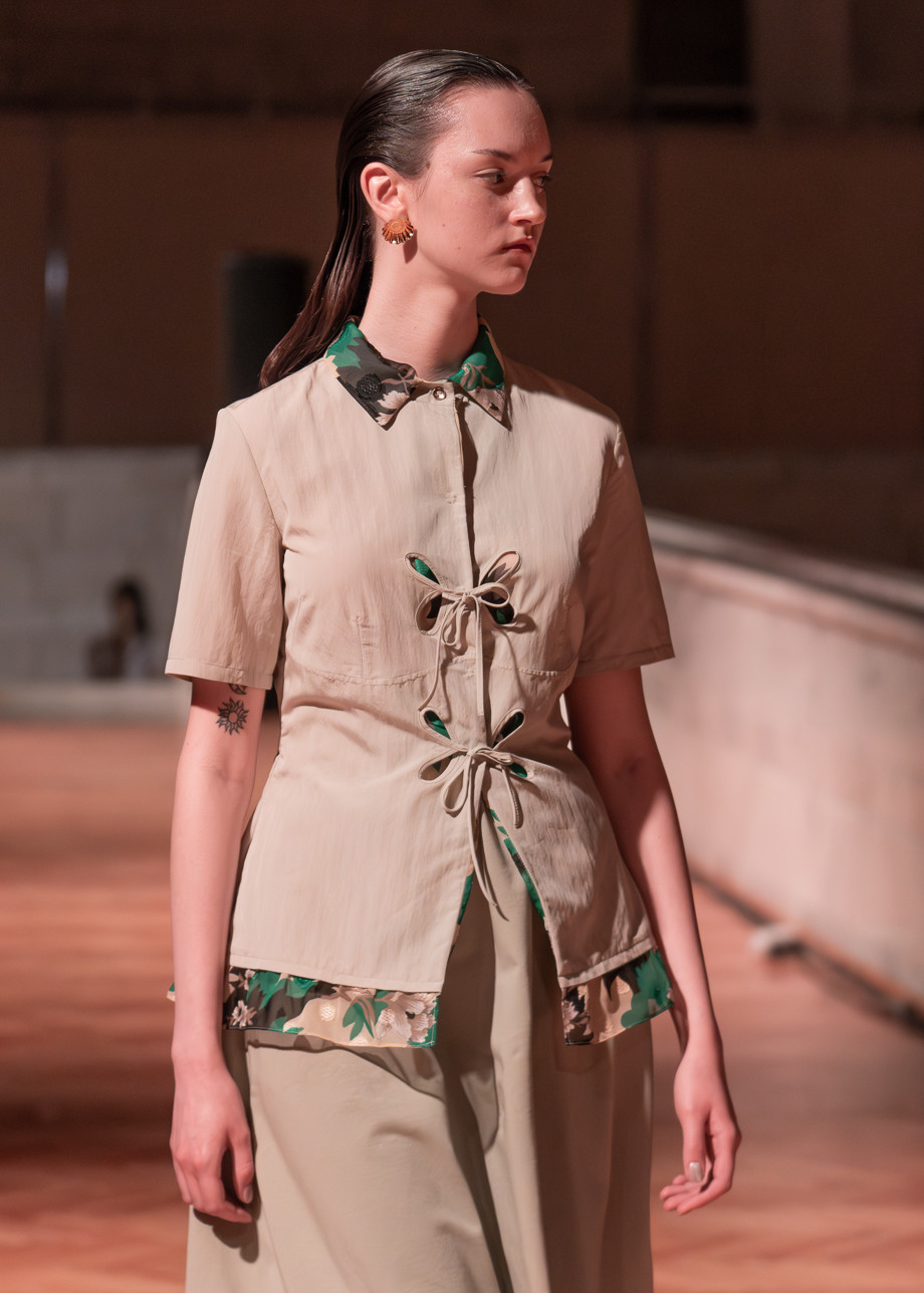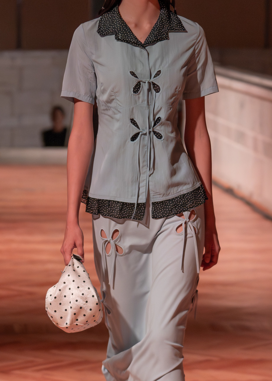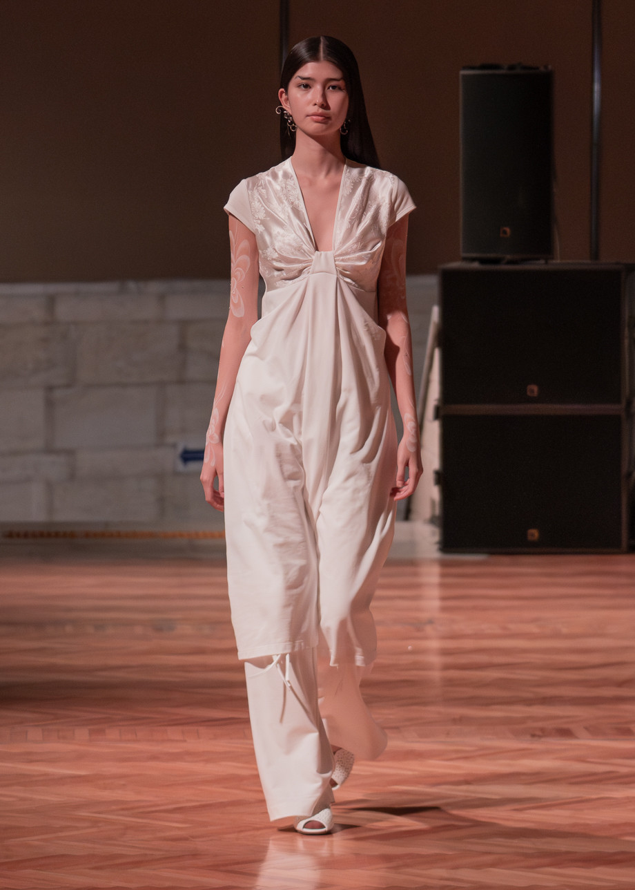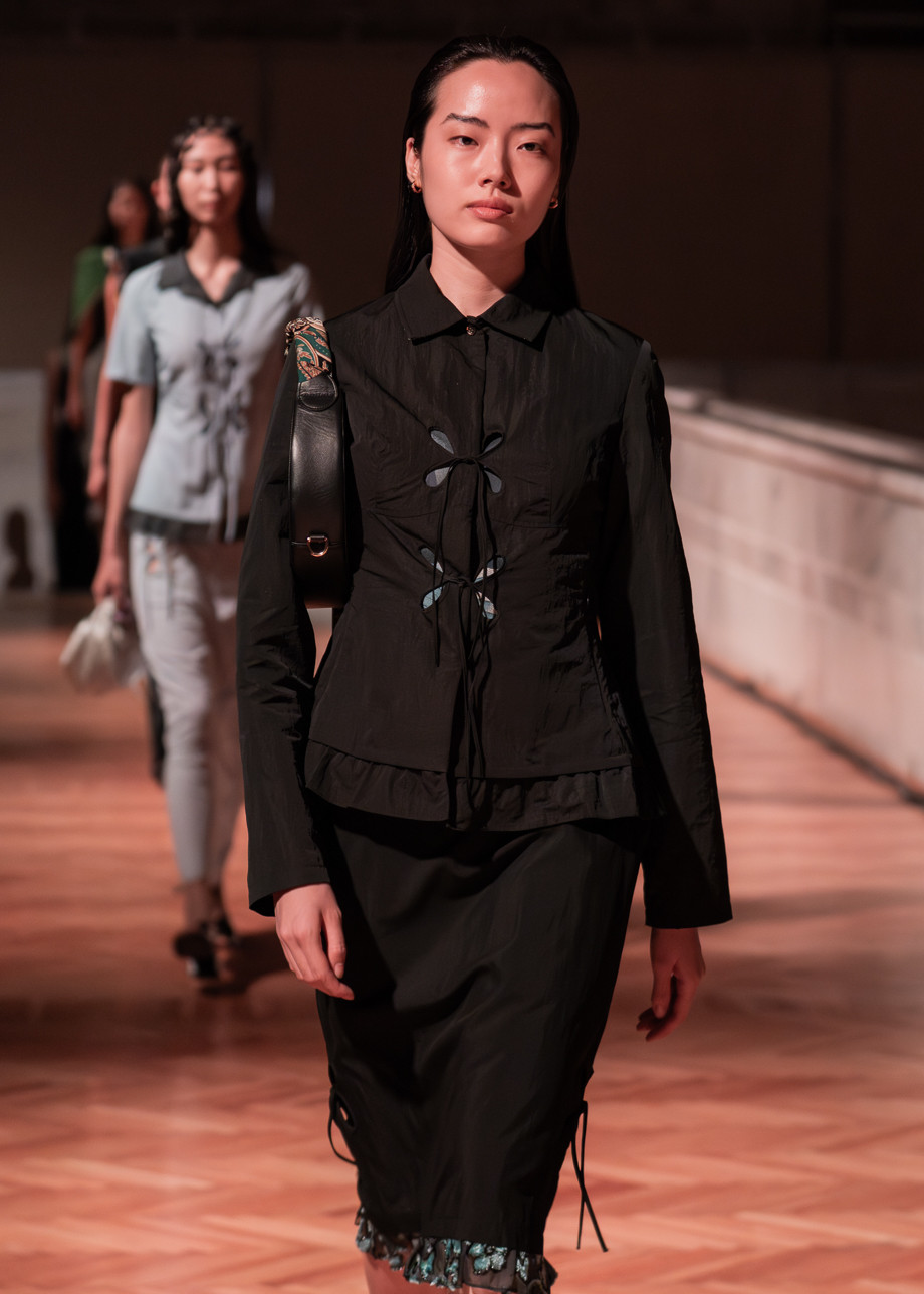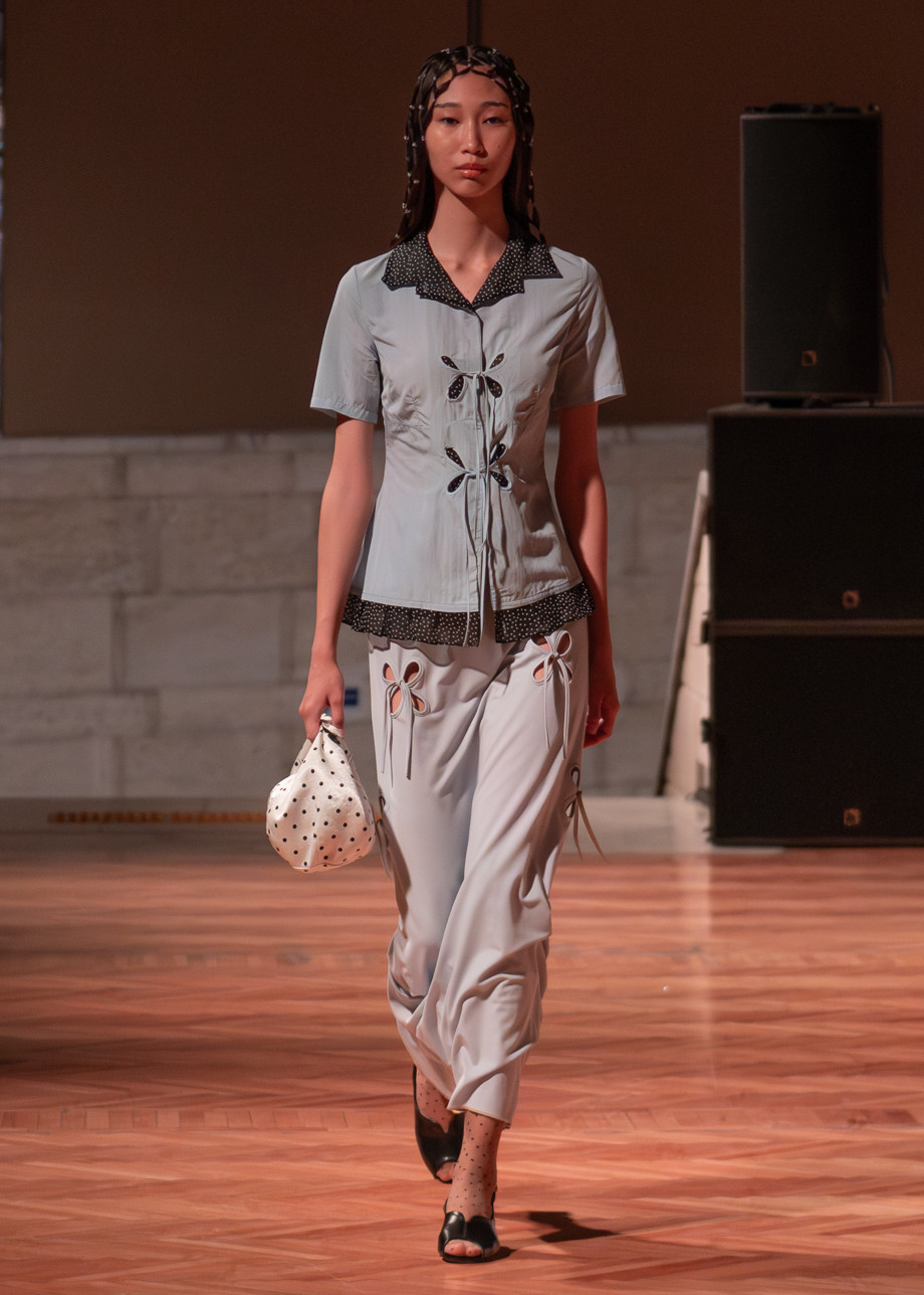 Модели выходили с пиалами, будто помогали накрывать на стол, а на ногах у них была «бабушкина» обувь со следочками – как носят наши тате. Атмосфера получилась настолько аутентичной, что хотелось усесться за стол и попросить чай. Впрочем, именно так гости и сделали в конце показа – стол, который был частью сет-дизайна, накрыли ташкентскими угощениями. Музыкальное сопровождение создал узбекский продюсер Josef Tumari: звуки ножа по доске, журчание воды, звон посуды и женское напевание без слов – все это складывалось в ту самую домашнюю симфонию.