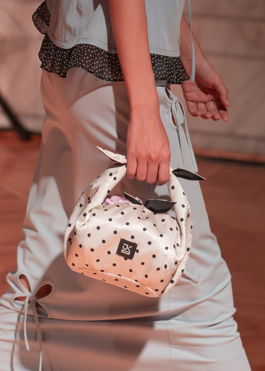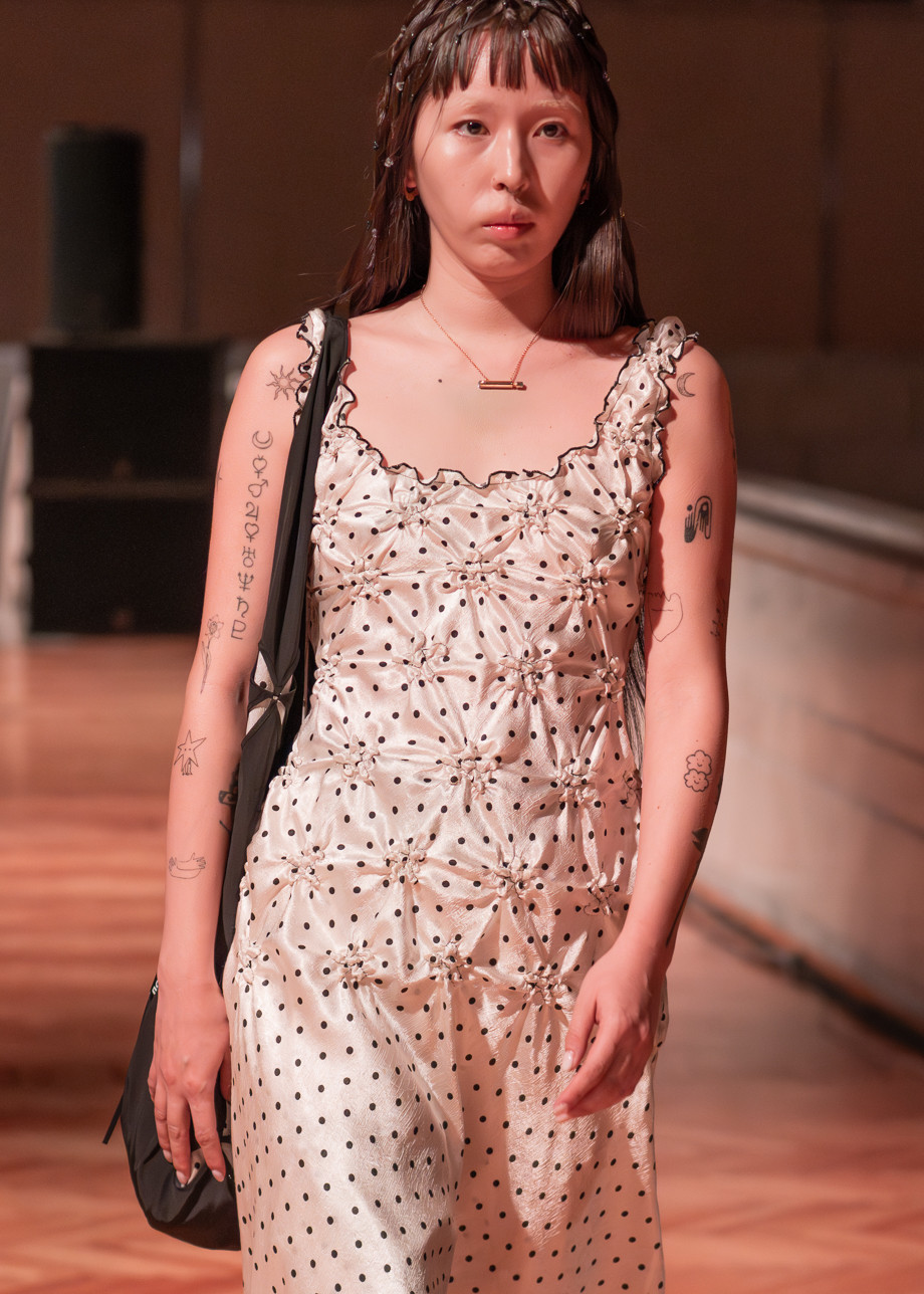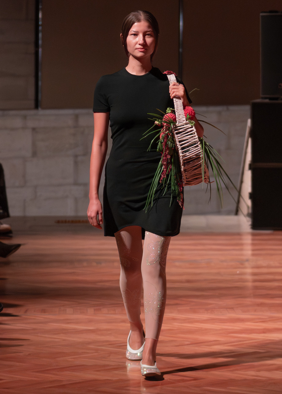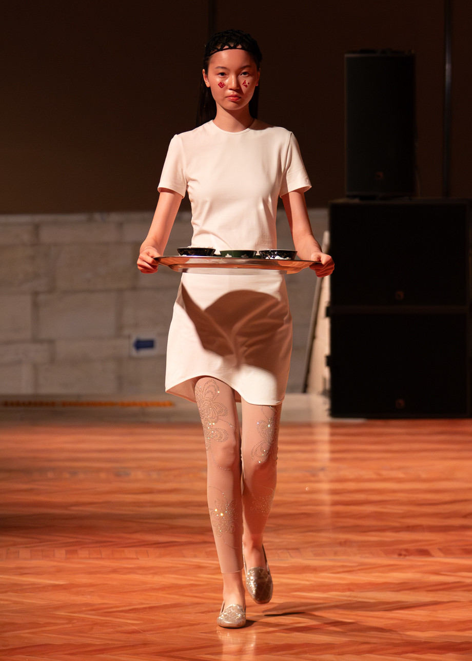 Модели выходили с пиалами, будто помогали накрывать на стол, а на ногах у них была «бабушкина» обувь со следочками – как носят наши тате. Атмосфера получилась настолько аутентичной, что хотелось усесться за стол и попросить чай. Впрочем, именно так гости и сделали в конце показа – стол, который был частью сет-дизайна, накрыли ташкентскими угощениями. Музыкальное сопровождение создал узбекский продюсер Josef Tumari: звуки ножа по доске, журчание воды, звон посуды и женское напевание без слов – все это складывалось в ту самую домашнюю симфонию.