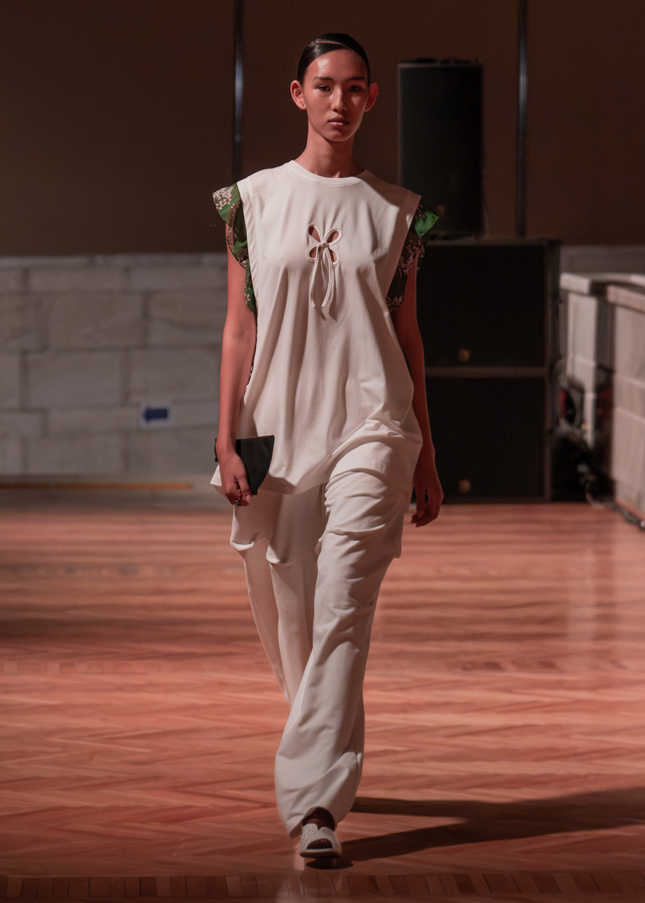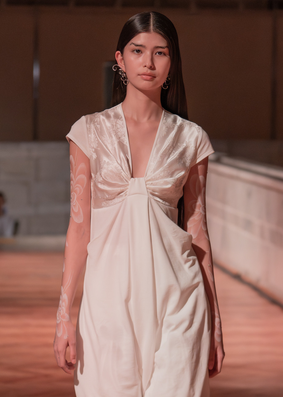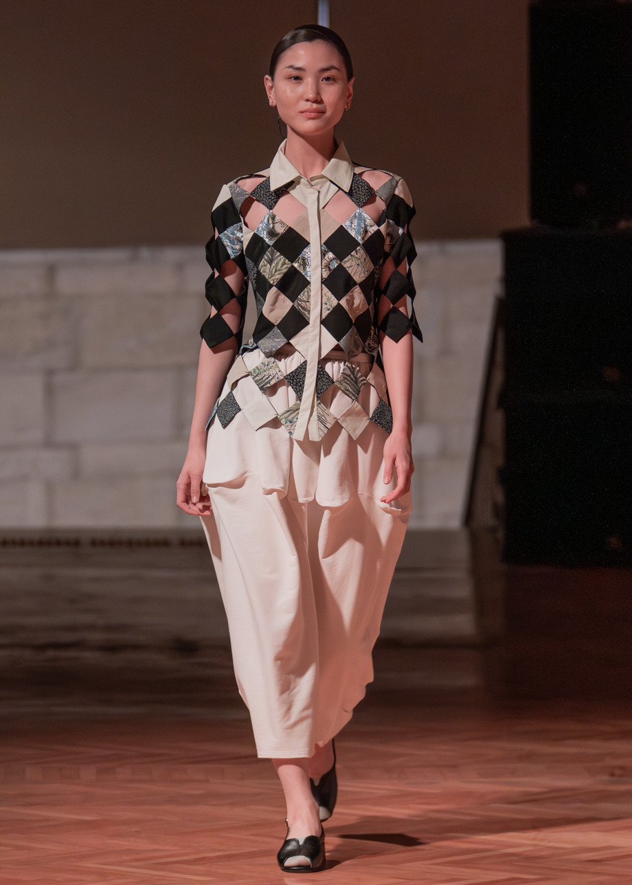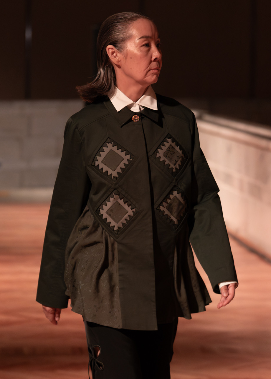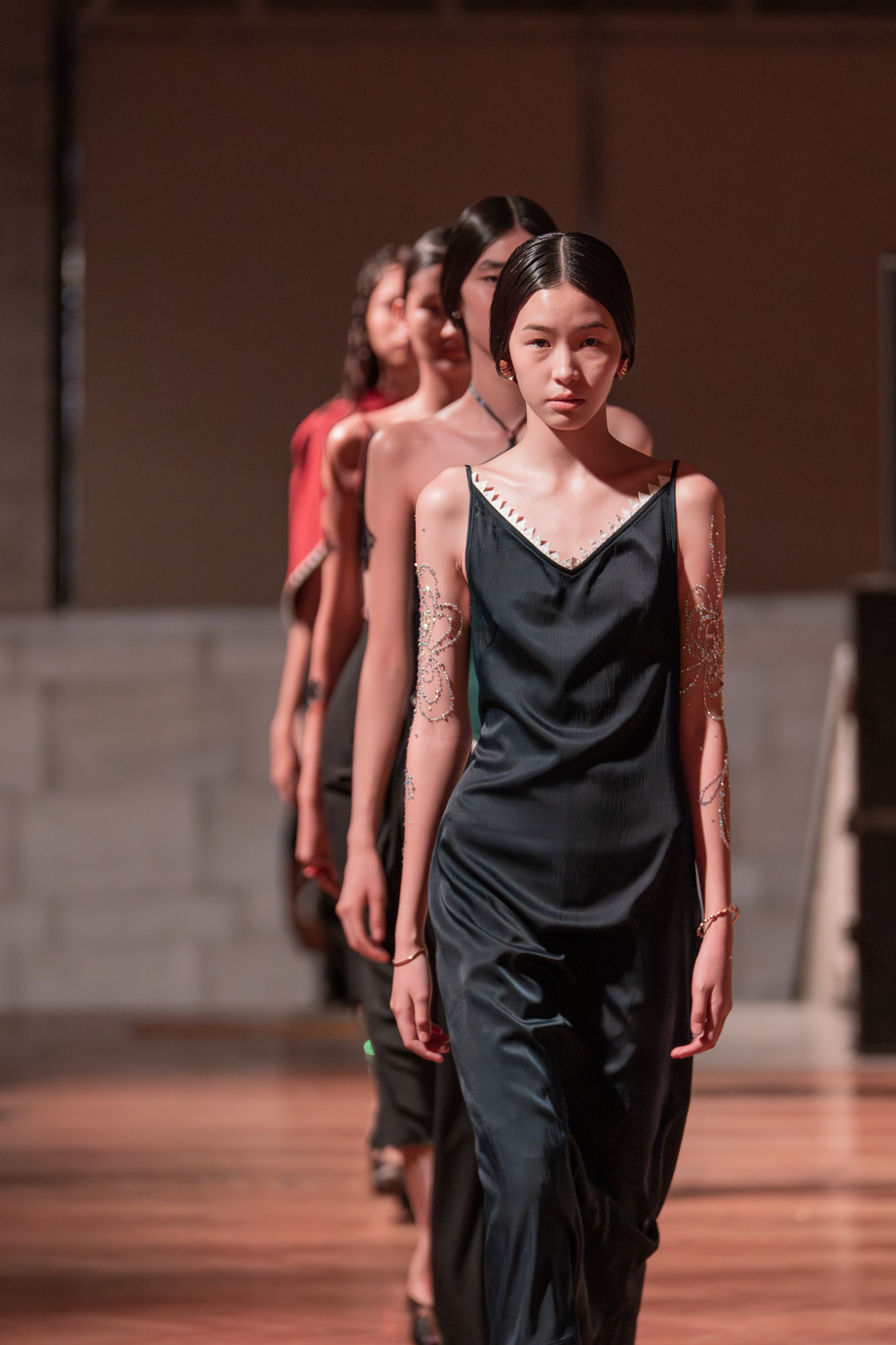 Модели выходили с пиалами, будто помогали накрывать на стол, а на ногах у них была «бабушкина» обувь со следочками – как носят наши тате. Атмосфера получилась настолько аутентичной, что хотелось усесться за стол и попросить чай. Впрочем, именно так гости и сделали в конце показа – стол, который был частью сет-дизайна, накрыли ташкентскими угощениями. Музыкальное сопровождение создал узбекский продюсер Josef Tumari: звуки ножа по доске, журчание воды, звон посуды и женское напевание без слов – все это складывалось в ту самую домашнюю симфонию.