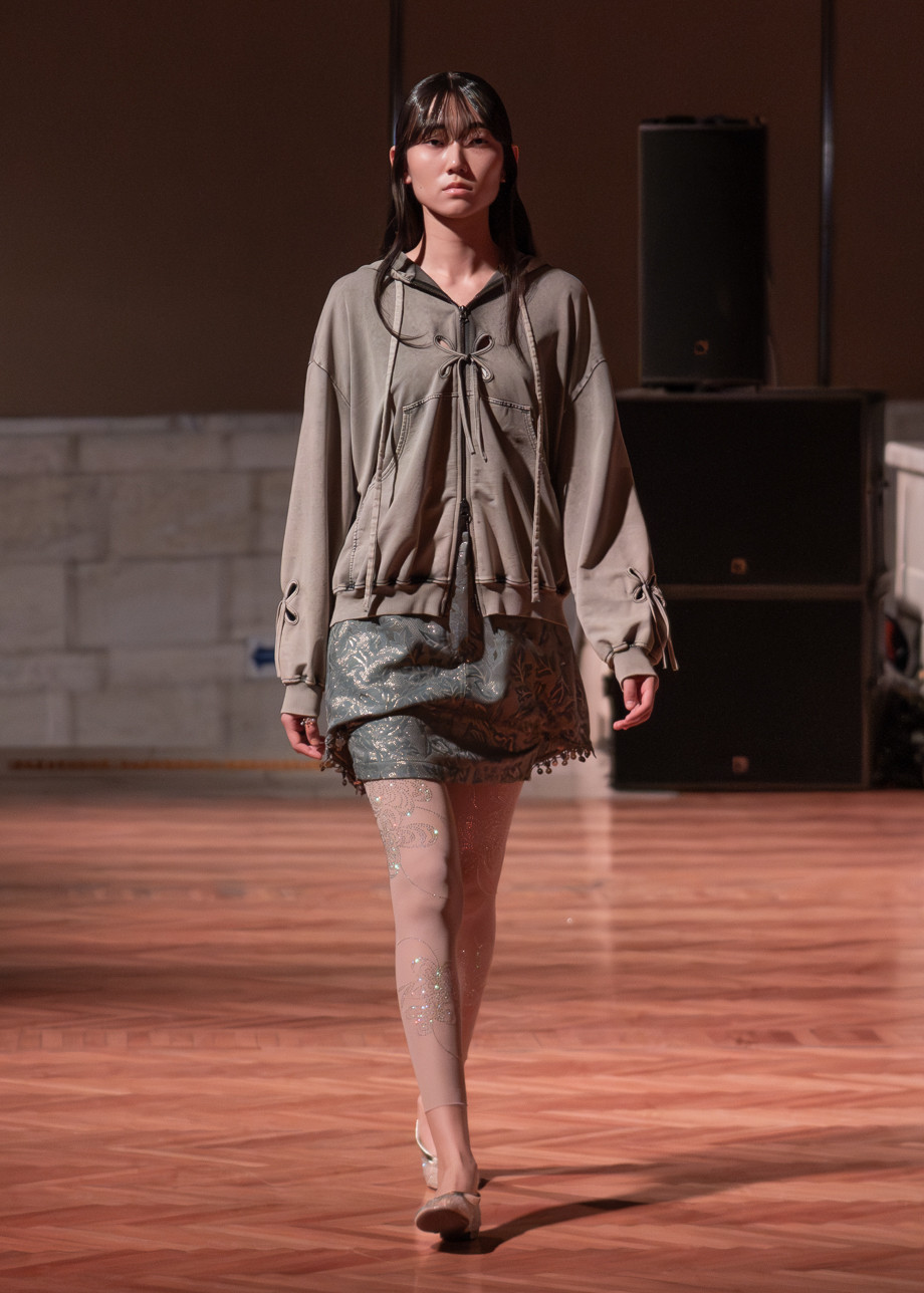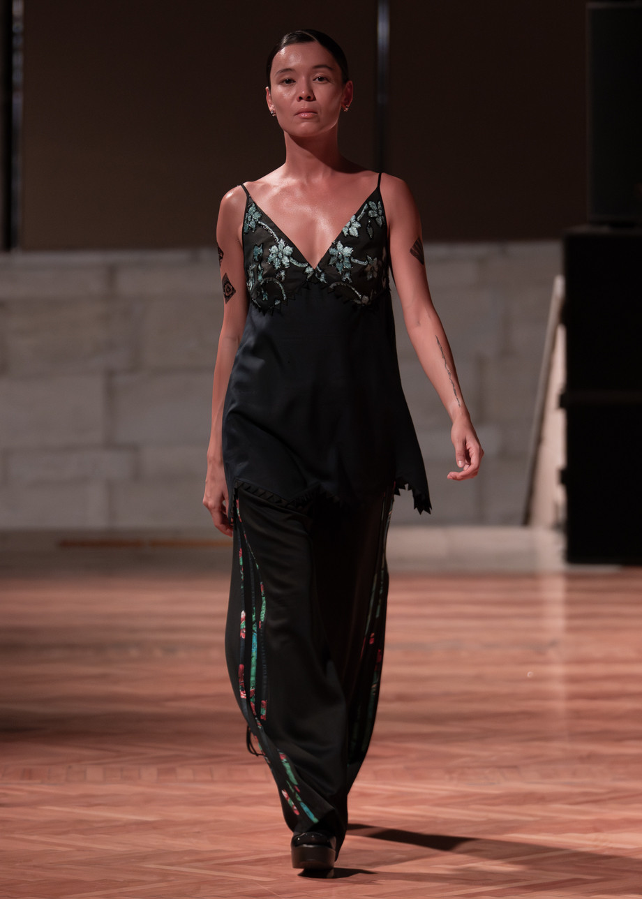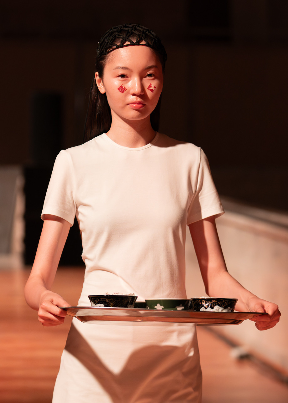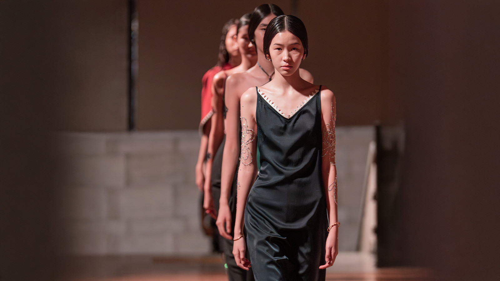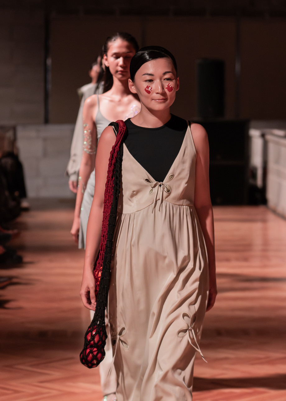 Модели выходили с пиалами, будто помогали накрывать на стол, а на ногах у них была «бабушкина» обувь со следочками – как носят наши тате. Атмосфера получилась настолько аутентичной, что хотелось усесться за стол и попросить чай. Впрочем, именно так гости и сделали в конце показа – стол, который был частью сет-дизайна, накрыли ташкентскими угощениями. Музыкальное сопровождение создал узбекский продюсер Josef Tumari: звуки ножа по доске, журчание воды, звон посуды и женское напевание без слов – все это складывалось в ту самую домашнюю симфонию.