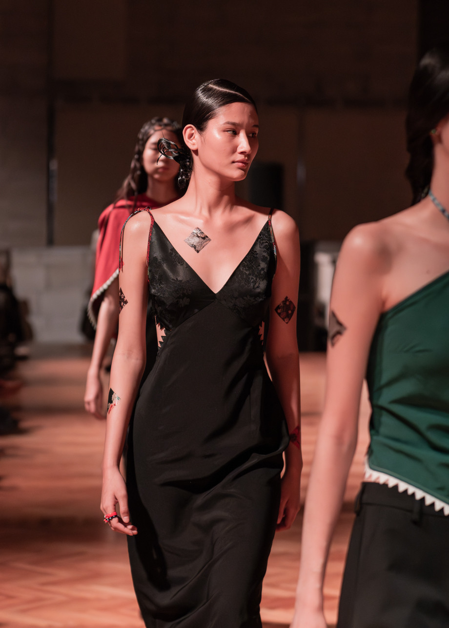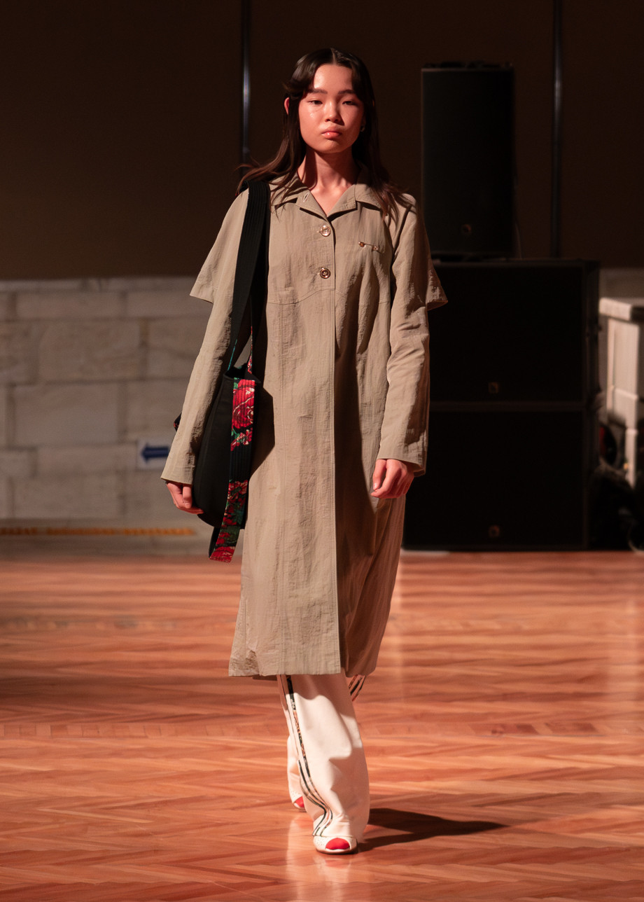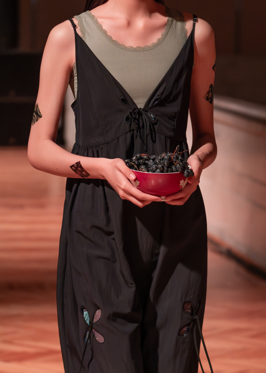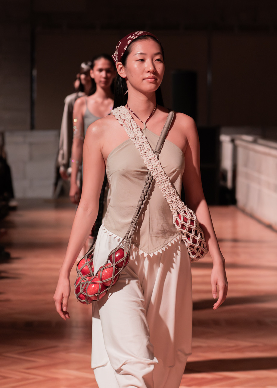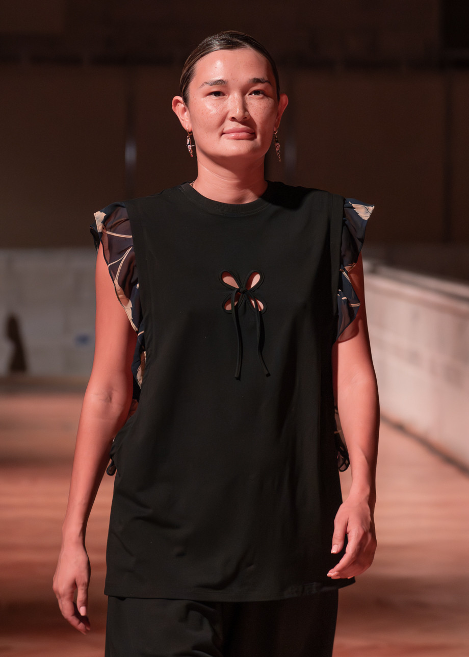 Модели выходили с пиалами, будто помогали накрывать на стол, а на ногах у них была «бабушкина» обувь со следочками – как носят наши тате. Атмосфера получилась настолько аутентичной, что хотелось усесться за стол и попросить чай. Впрочем, именно так гости и сделали в конце показа – стол, который был частью сет-дизайна, накрыли ташкентскими угощениями. Музыкальное сопровождение создал узбекский продюсер Josef Tumari: звуки ножа по доске, журчание воды, звон посуды и женское напевание без слов – все это складывалось в ту самую домашнюю симфонию.