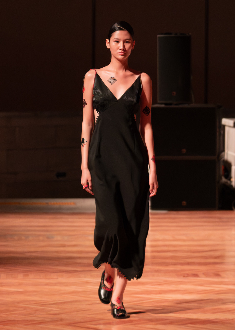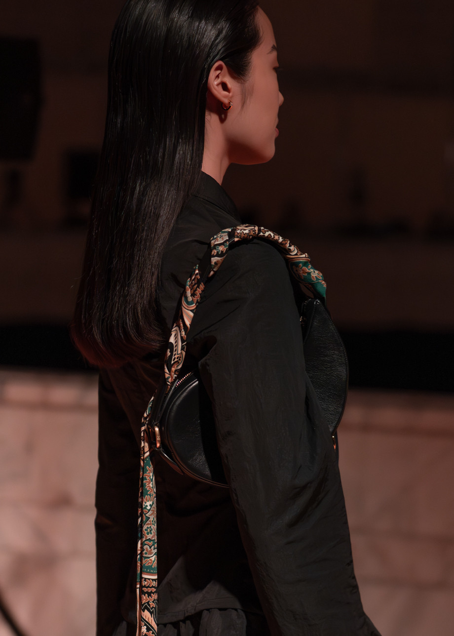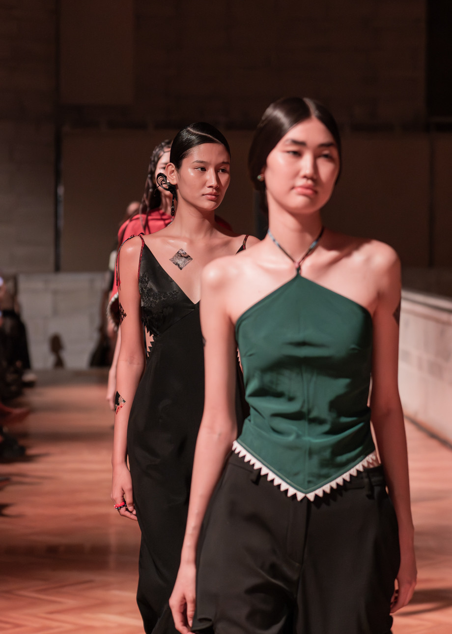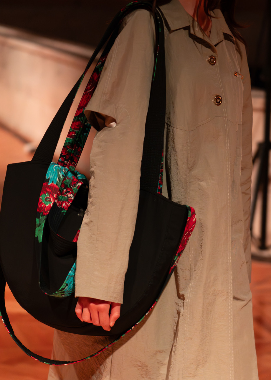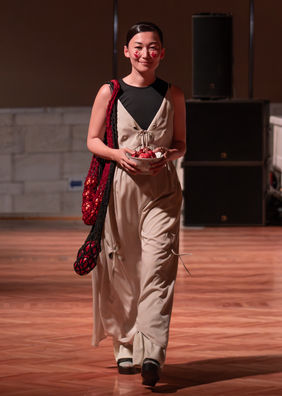 Модели выходили с пиалами, будто помогали накрывать на стол, а на ногах у них была «бабушкина» обувь со следочками – как носят наши тате. Атмосфера получилась настолько аутентичной, что хотелось усесться за стол и попросить чай. Впрочем, именно так гости и сделали в конце показа – стол, который был частью сет-дизайна, накрыли ташкентскими угощениями. Музыкальное сопровождение создал узбекский продюсер Josef Tumari: звуки ножа по доске, журчание воды, звон посуды и женское напевание без слов – все это складывалось в ту самую домашнюю симфонию.