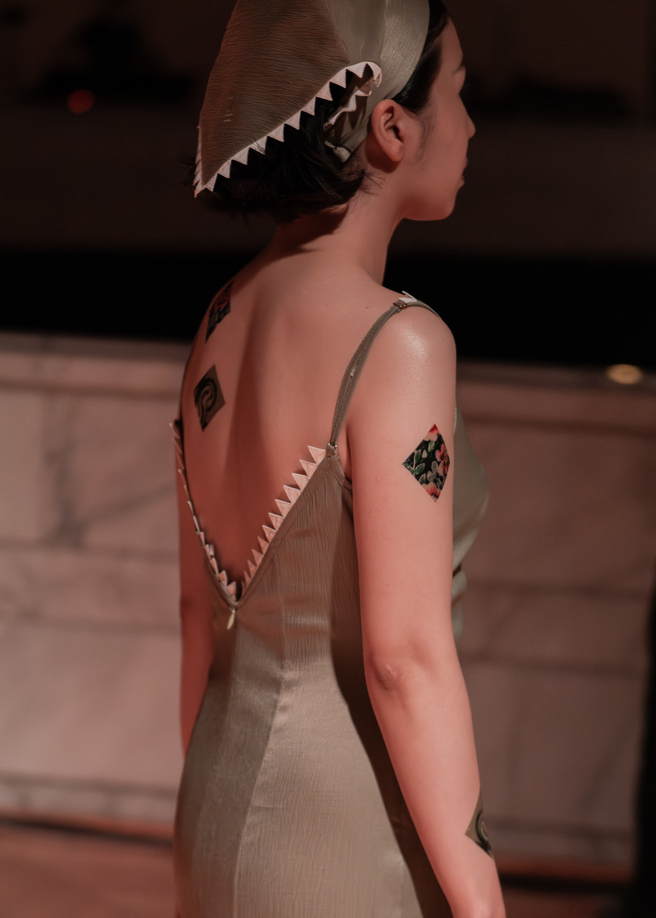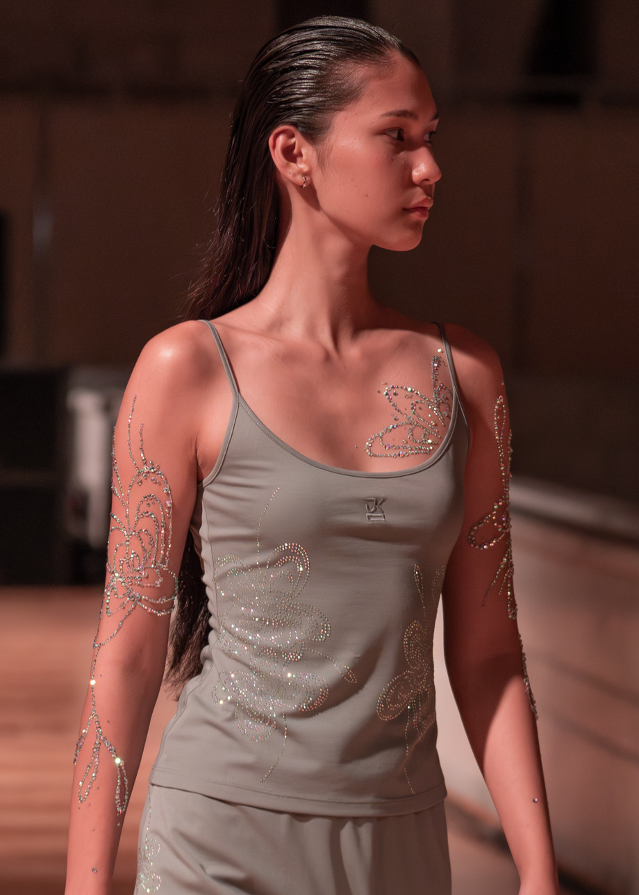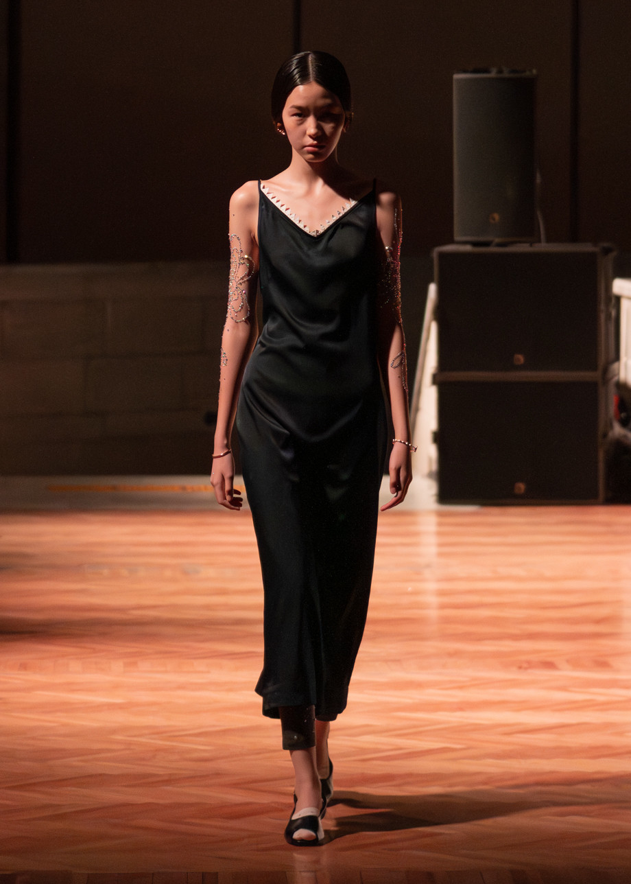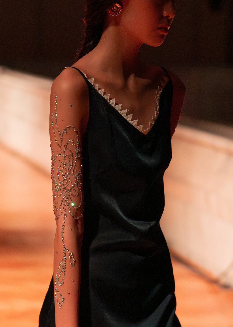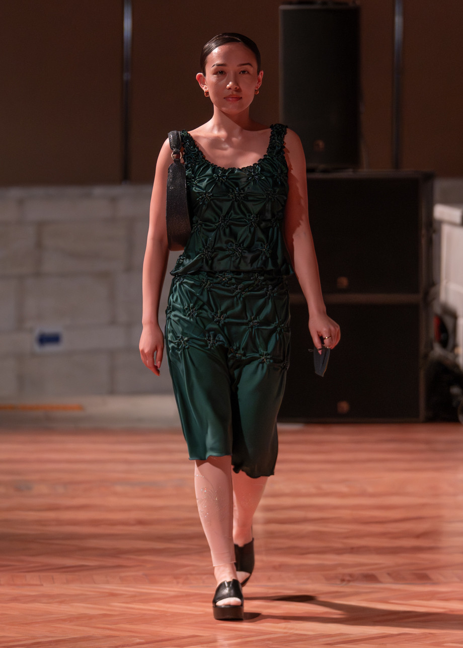 Модели выходили с пиалами, будто помогали накрывать на стол, а на ногах у них была «бабушкина» обувь со следочками – как носят наши тате. Атмосфера получилась настолько аутентичной, что хотелось усесться за стол и попросить чай. Впрочем, именно так гости и сделали в конце показа – стол, который был частью сет-дизайна, накрыли ташкентскими угощениями. Музыкальное сопровождение создал узбекский продюсер Josef Tumari: звуки ножа по доске, журчание воды, звон посуды и женское напевание без слов – все это складывалось в ту самую домашнюю симфонию.