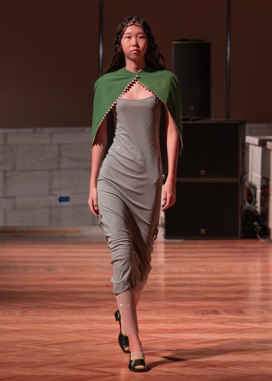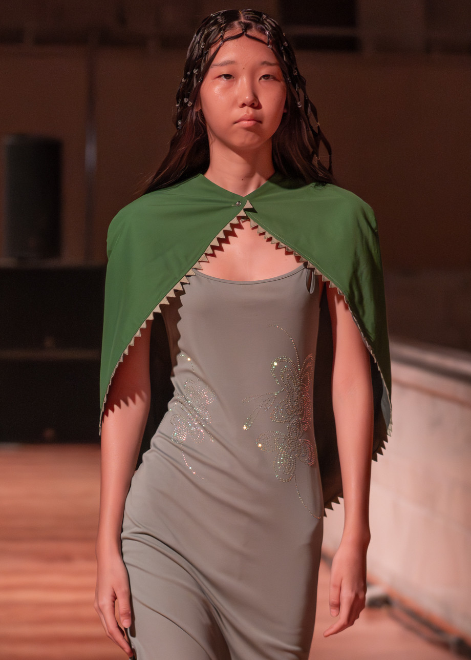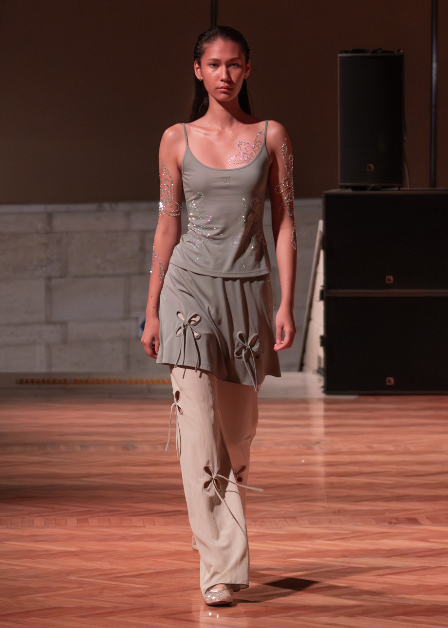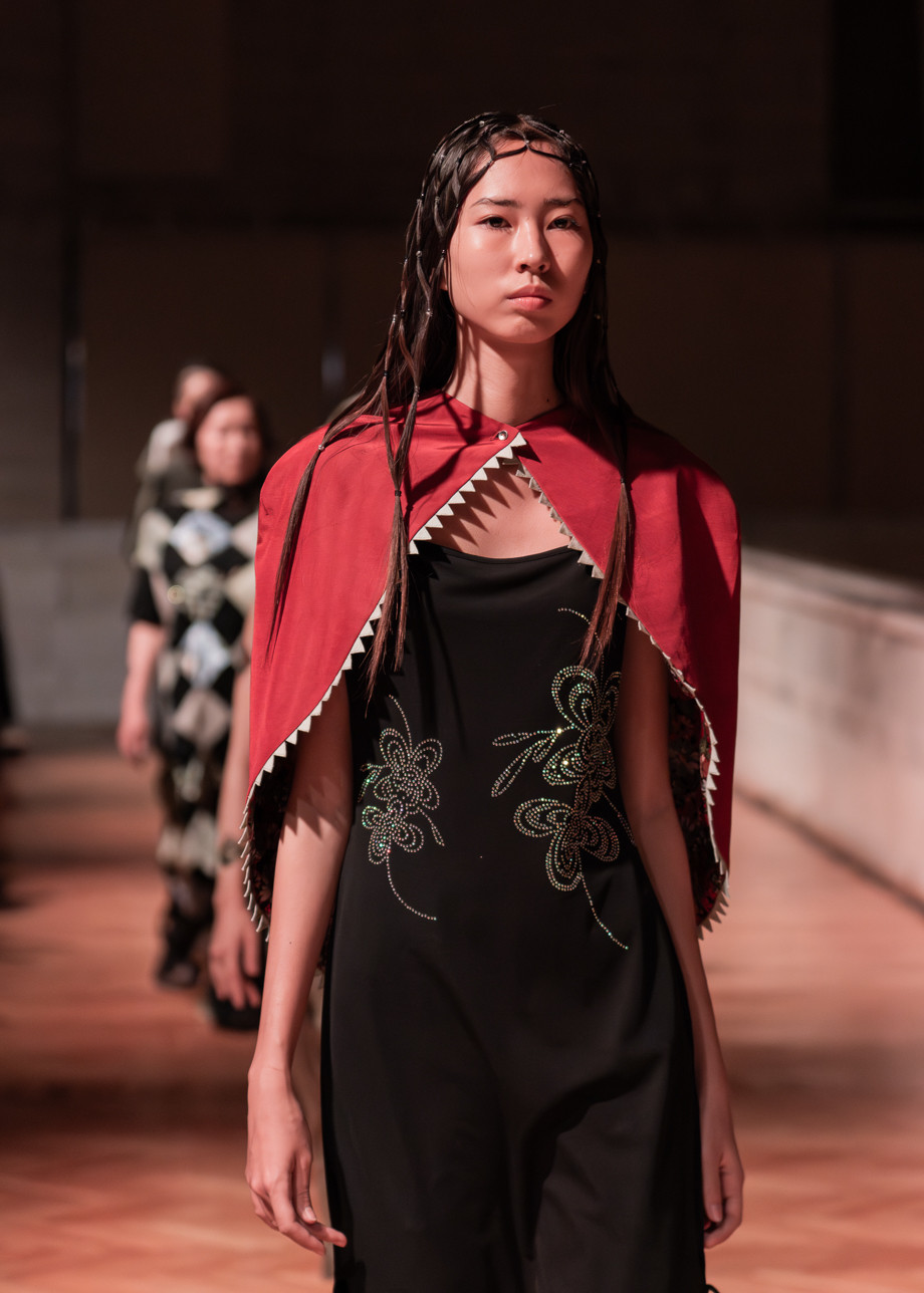 Сама коллекция – словно пазл из воспоминаний каждой центральноазиатской девочки: лоскутные одеяла в технике курок (құрақ), платки для волос, накидки-шали, авоськи и даже кексницы. Эти кексницы, кстати, стали частью сет-дизайна – символ заботы и рук наших мам и бабушек. Игривости коллекции добавило обилие страз на капроновых леггинсах и стразы, наклеенные на руки и одежду. Именно такими стразами мы когда-то украшали дневники и анкеты, а я в школьные годы ими обклеила свою розовую раскладушку Motorola Razr.