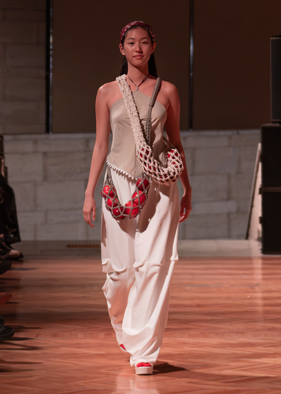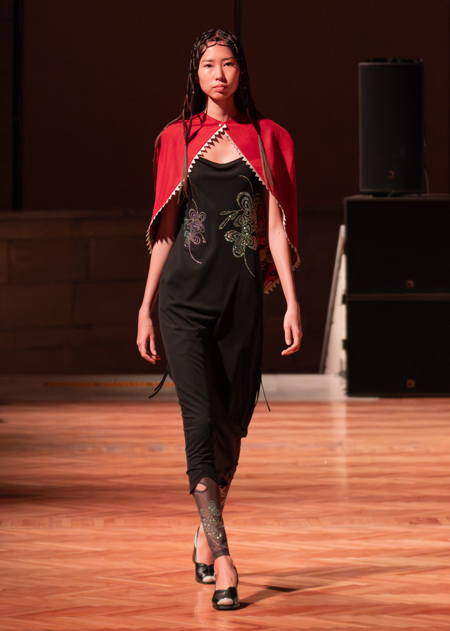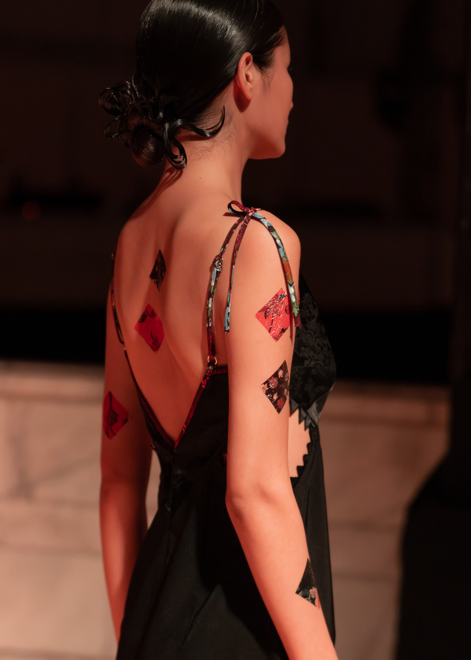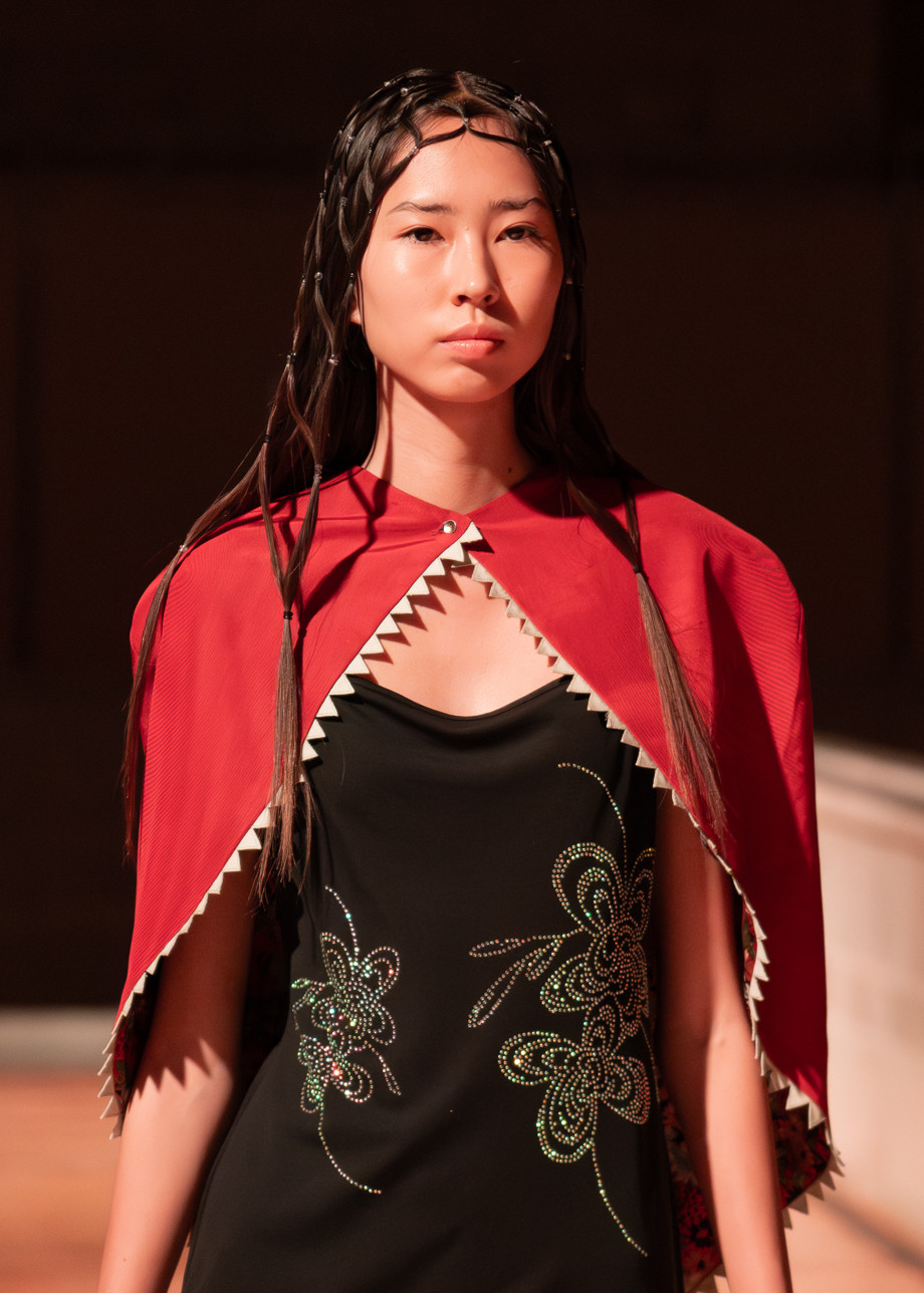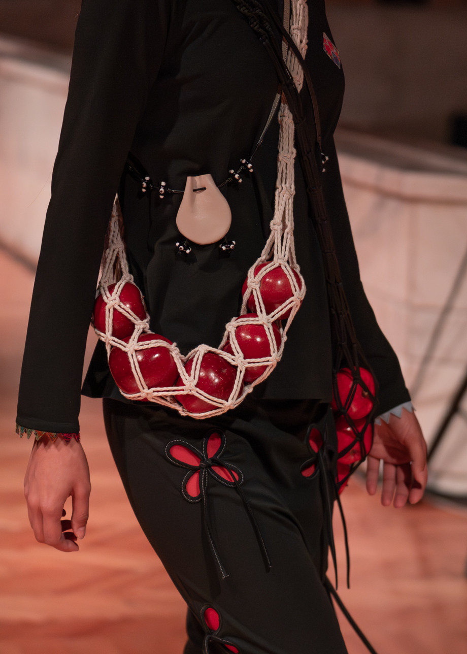 Сама коллекция – словно пазл из воспоминаний каждой центральноазиатской девочки: лоскутные одеяла в технике курок (құрақ), платки для волос, накидки-шали, авоськи и даже кексницы. Эти кексницы, кстати, стали частью сет-дизайна – символ заботы и рук наших мам и бабушек. Игривости коллекции добавило обилие страз на капроновых леггинсах и стразы, наклеенные на руки и одежду. Именно такими стразами мы когда-то украшали дневники и анкеты, а я в школьные годы ими обклеила свою розовую раскладушку Motorola Razr.
