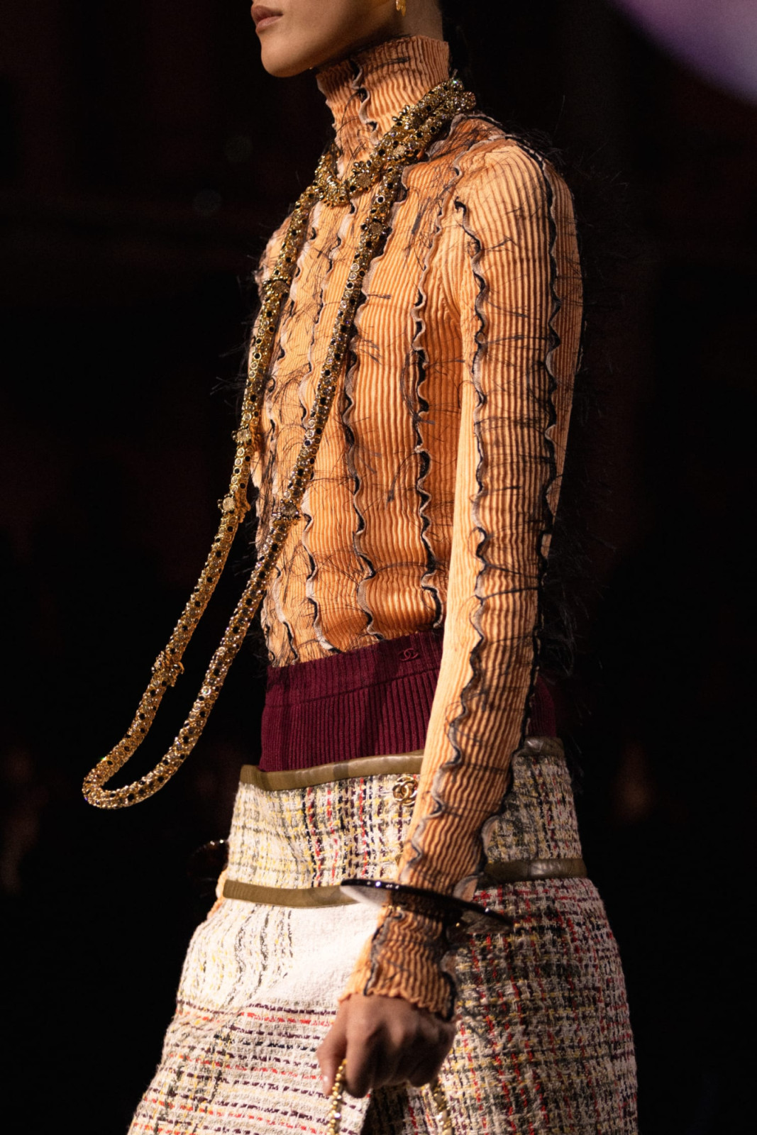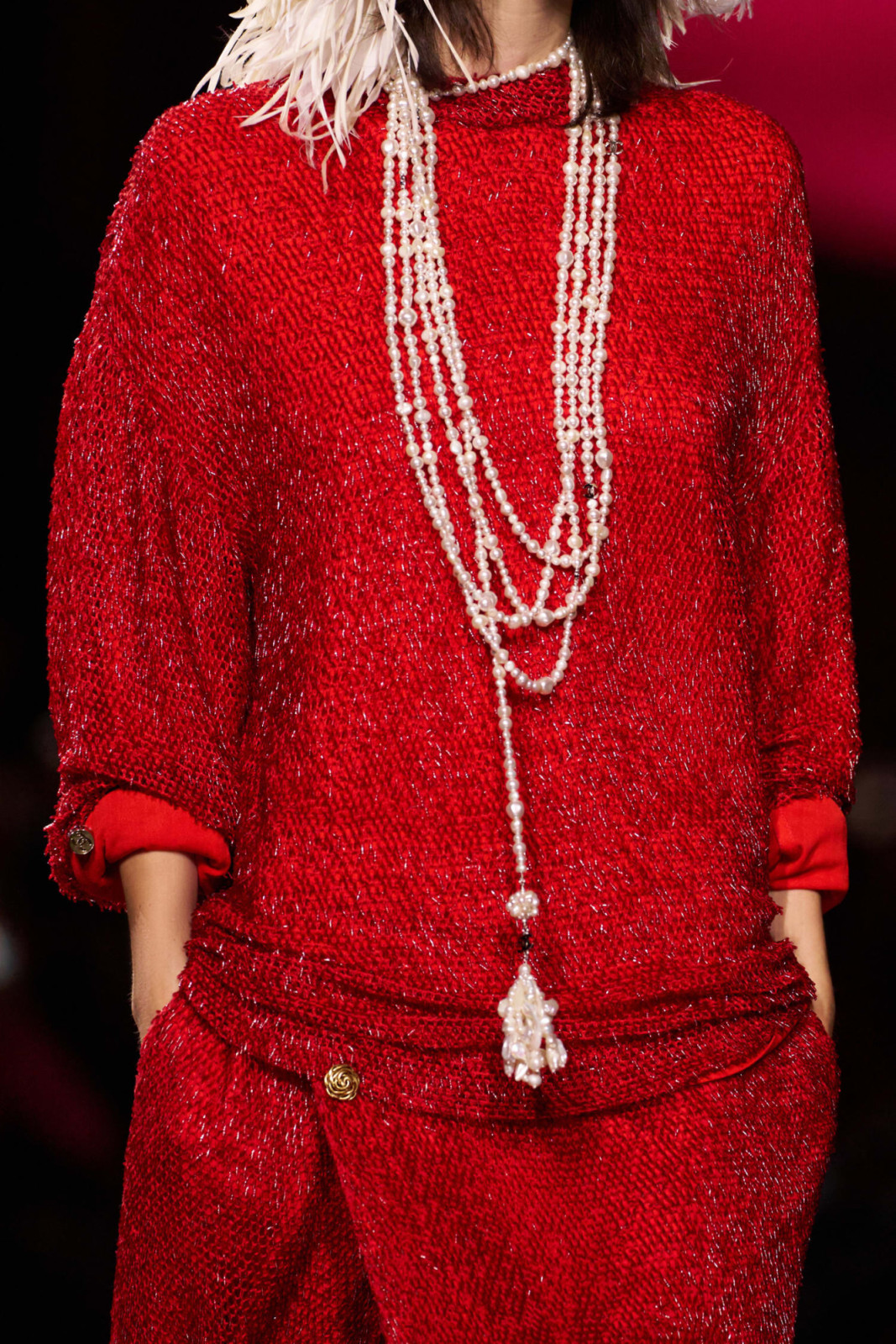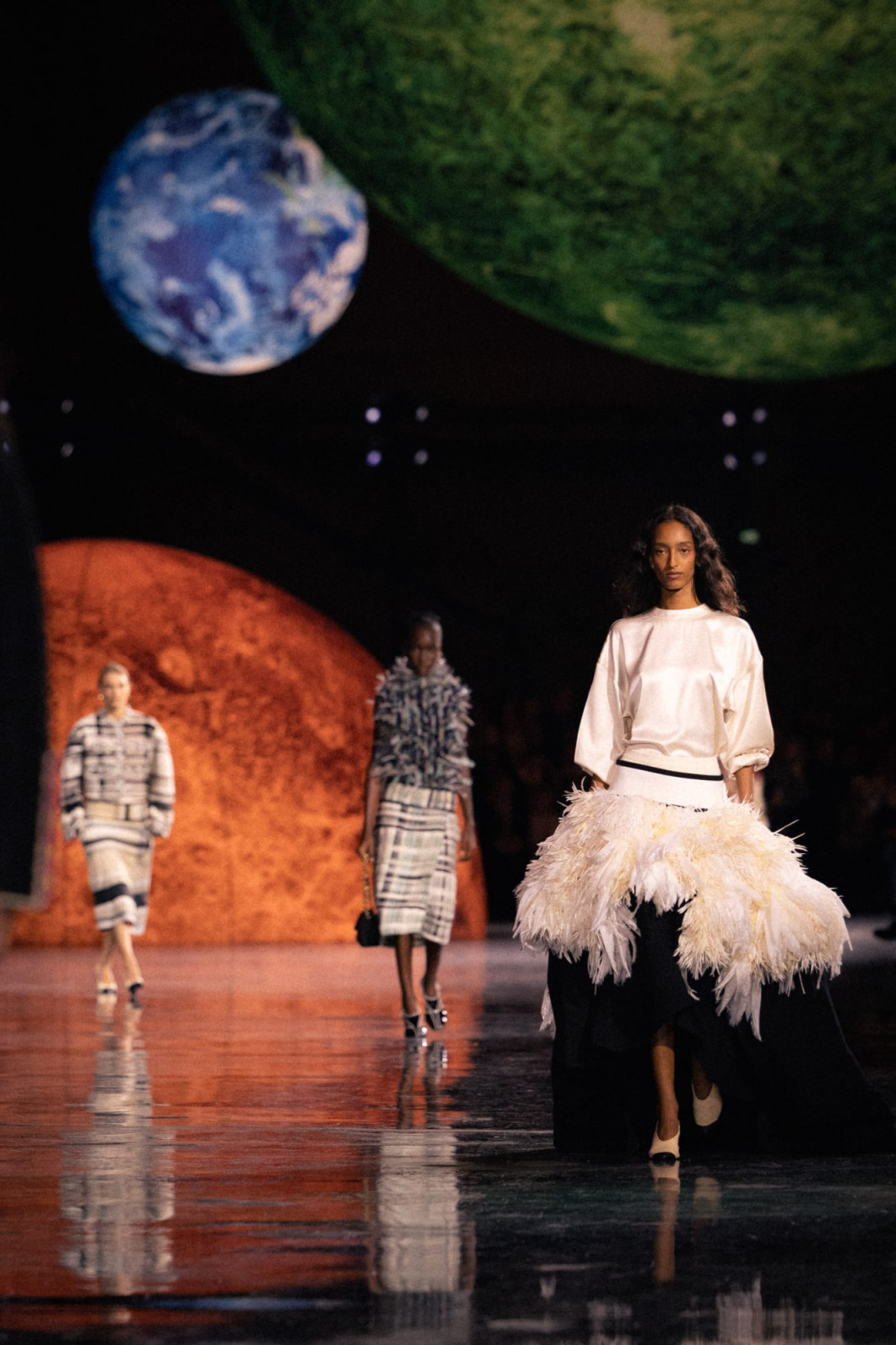 Дизайнер переосмыслил классический для дома твид, сделав его почти невесомым. В дебютной женской коллекции для Chanel он сосредоточился на деталях – аксессуарах, пышных юбках, головных уборах из перьев и вышивке на тонких прозрачных тканях.