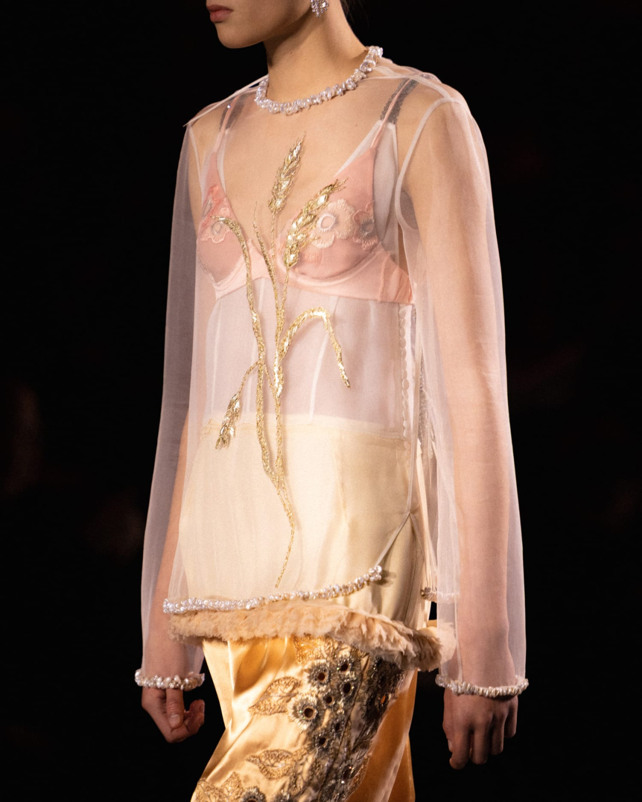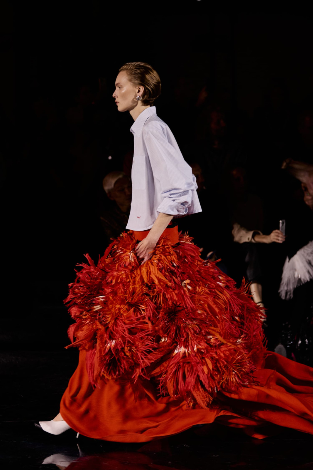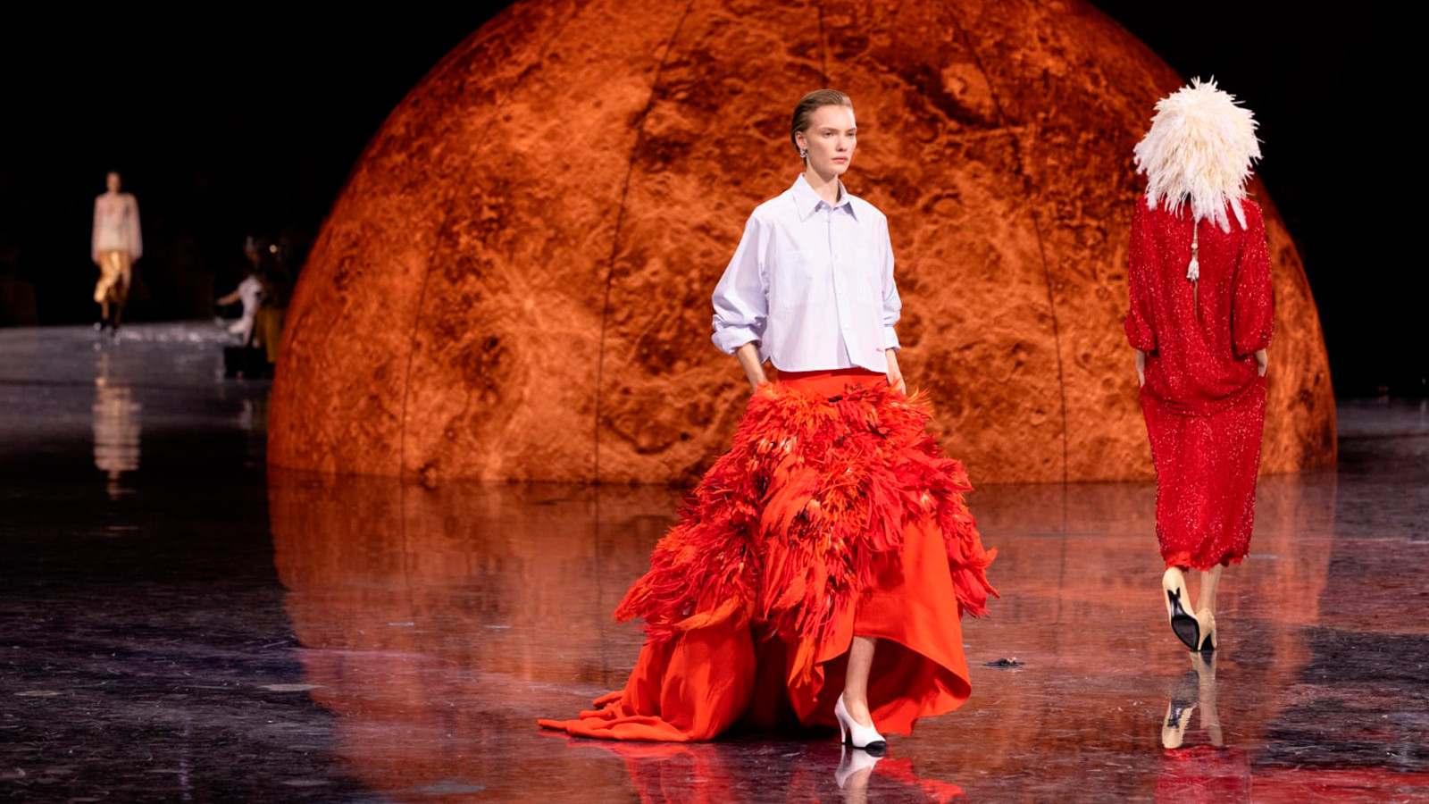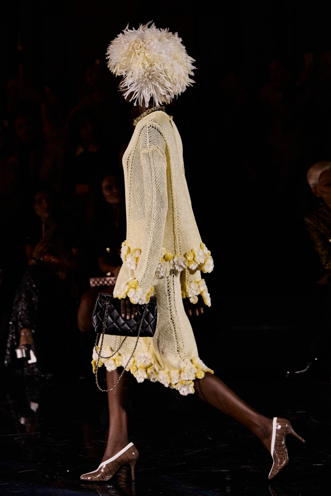 Дизайнер переосмыслил классический для дома твид, сделав его почти невесомым. В дебютной женской коллекции для Chanel он сосредоточился на деталях – аксессуарах, пышных юбках, головных уборах из перьев и вышивке на тонких прозрачных тканях.